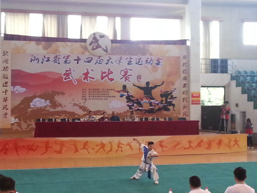 四年一届的浙江省第十四届大学生运动会武术比赛于2015年4月26-29日在浙江医药高等专科学校举行,经过层层选拔,我院选派了一位运动员参加了此次比赛,由黄文明老师担任领队、顾才铭老师担任教练。本次比赛有来自全省17所高职院校、100多名大学生运动健儿参加武术套路比赛的激烈角逐。我院舞蹈系13编导班刘乐同学参加了男子长拳和刀术两个项目,经过激励的角逐,刘乐同学获得了男子长拳第二名、男子刀术第三名的好成绩,同时我院代表队获得了男子团体第七名的好成绩,顾才铭老师获得了“优秀教练员”称号、刘乐同学获得“优秀运动员”称号。