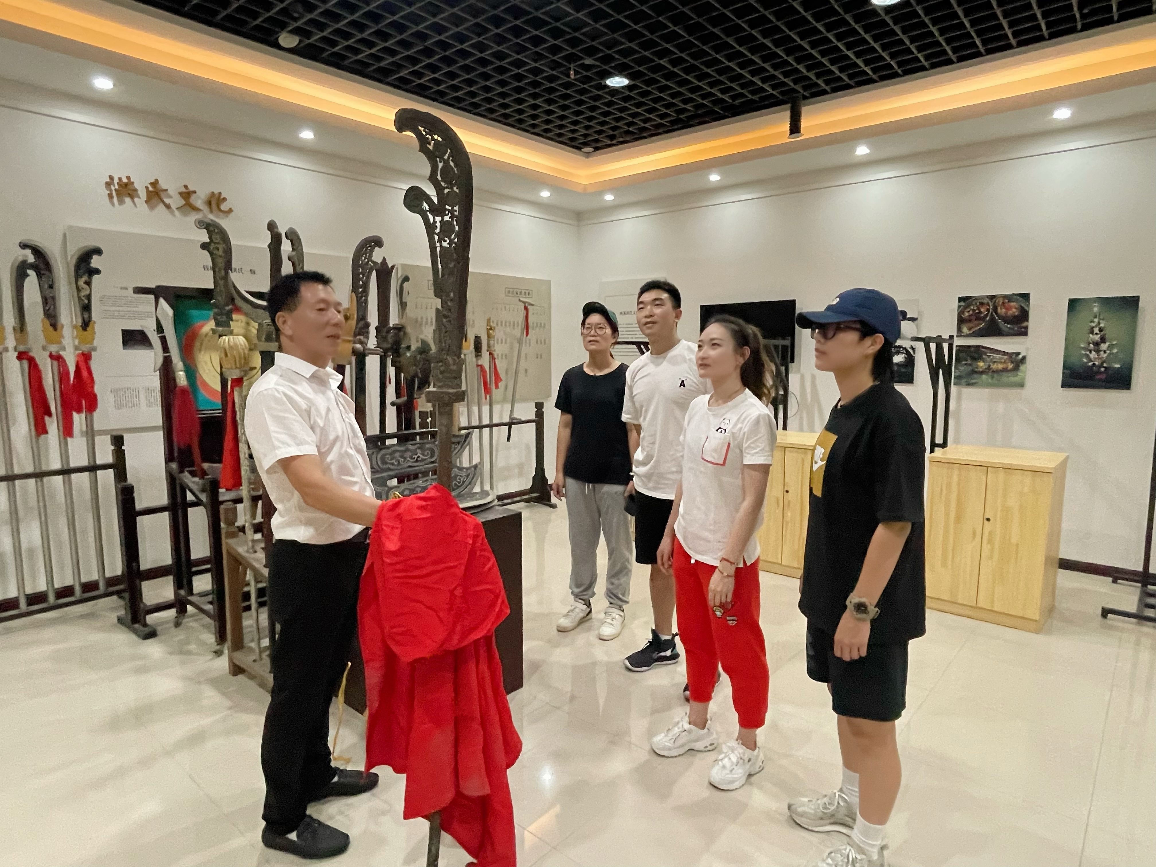 最后,科研团队参观了“五常十八般武艺”陈列馆,在陈列馆内,展出了由明代传承至今的“十八件”兵器,是非常宝贵的遗产,虽然历经年华与磨难,但仍然能感受到那精致的雕工与古人的智慧,不得不令人赞叹。陈列馆内除了展示兵器、传承人谱外,还展示了“五常十八般武艺”开展的各类活动、演出、赛事等,其中包含了一支特殊的队伍——女子“十八般武艺”队,是一道靓丽的风景线。