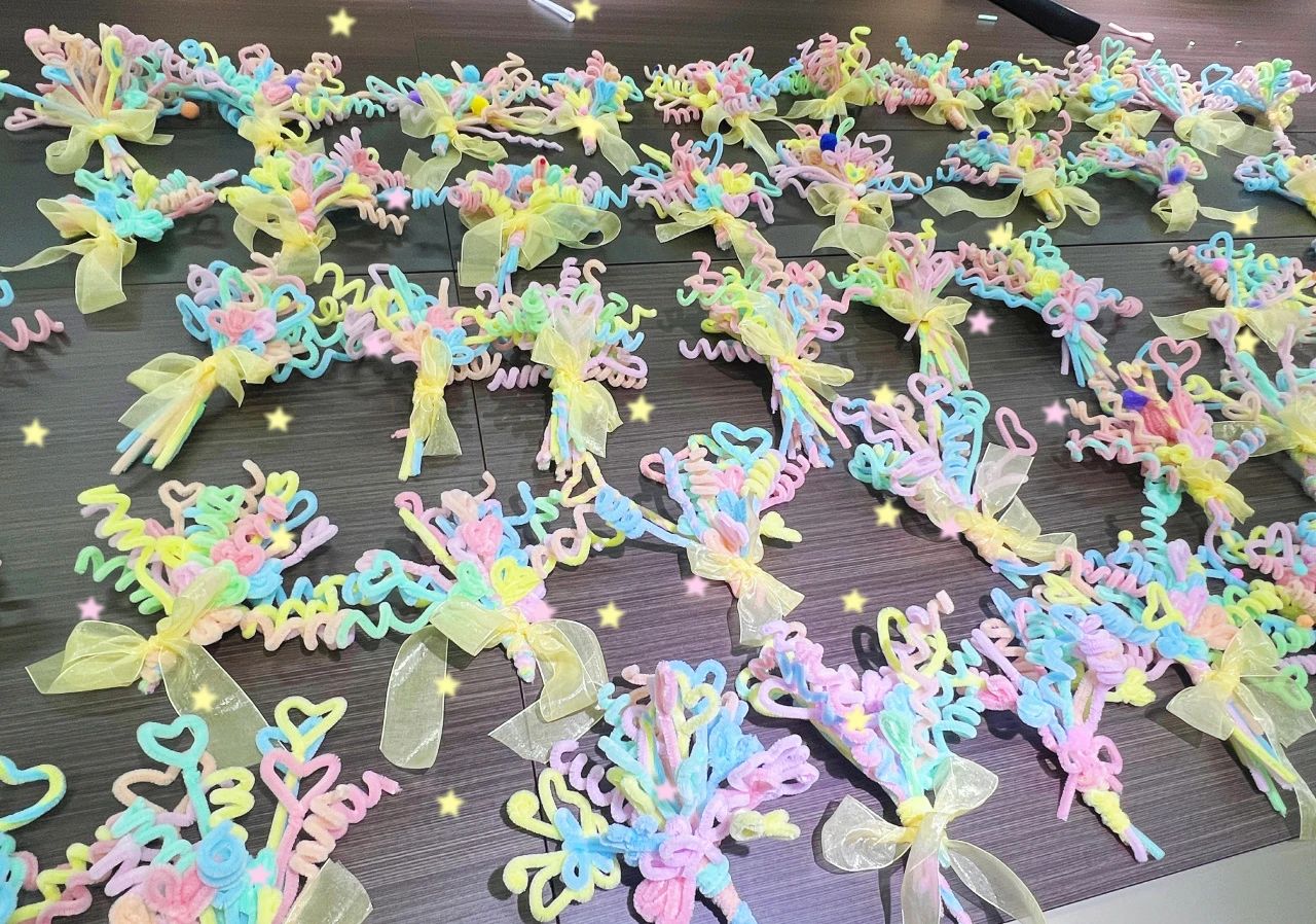 课余时间的教室变身创意工坊,同学们围坐成圈,对着教程反复练习扭、折、绕的技巧。有人将粉色扭棒卷成含羞的爱心,有人把金丝拧作向日葵的灿烂,更有巧手的同学为花束系上丝带,附上手写卡片。