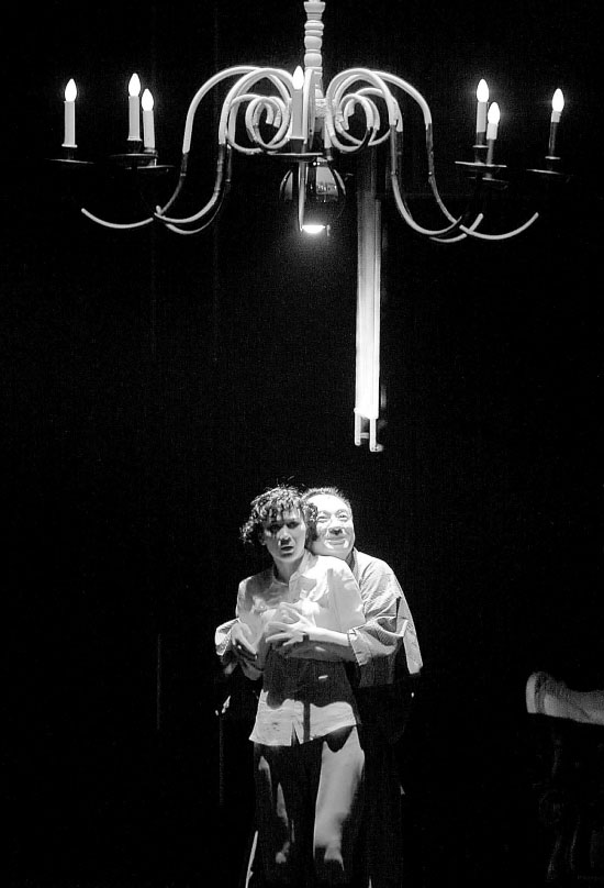 演出一开始,舞台首先让观众感觉新奇。整个舞台是斜的,有20度左右的倾角。因此,地面铺上了地毯以增加摩擦力,便于道具摆放。舞台前,暗藏了一个小坡。舞台上,还有一座楼梯。三个坡度,构成了斜线为主的舞台线条。随着剧情展开,观众会发现台上的每个场景也都是失衡的状态,每个角色都在精神高度紧张状态中演出。