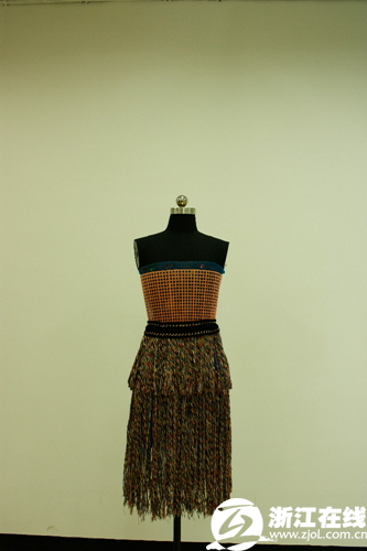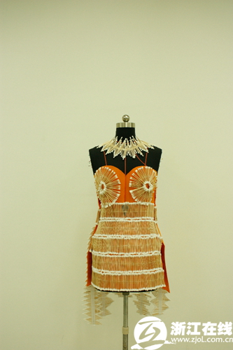 这是浙艺院美术系服装专业第一届创意与技能教学实践,展出作品共有26件,创意云集、亮点纷呈。11服装班和12服装班全体学生共52名学生参加,以两人为一个小组,在限定时间内使用非辅用材料设计制作一件服装单品。这不仅是对同学们专业知识的考核,更是对团队协作能力的测试。