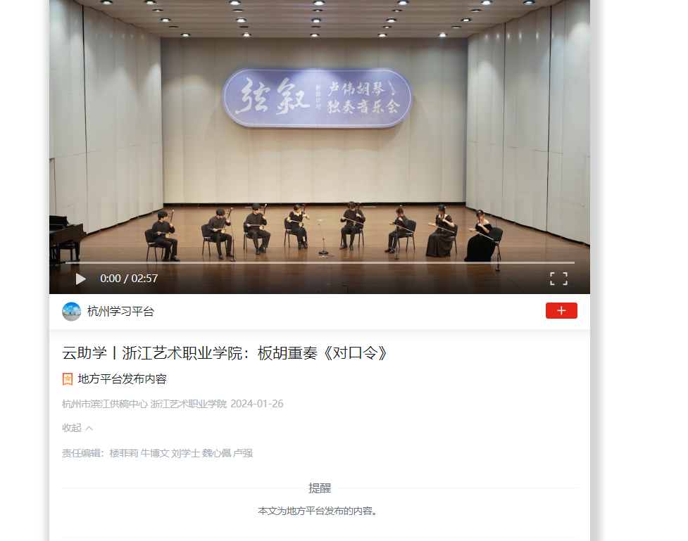 学习强国杭州平台:云助学丨浙江艺术职业学院:板胡重奏《对口令》