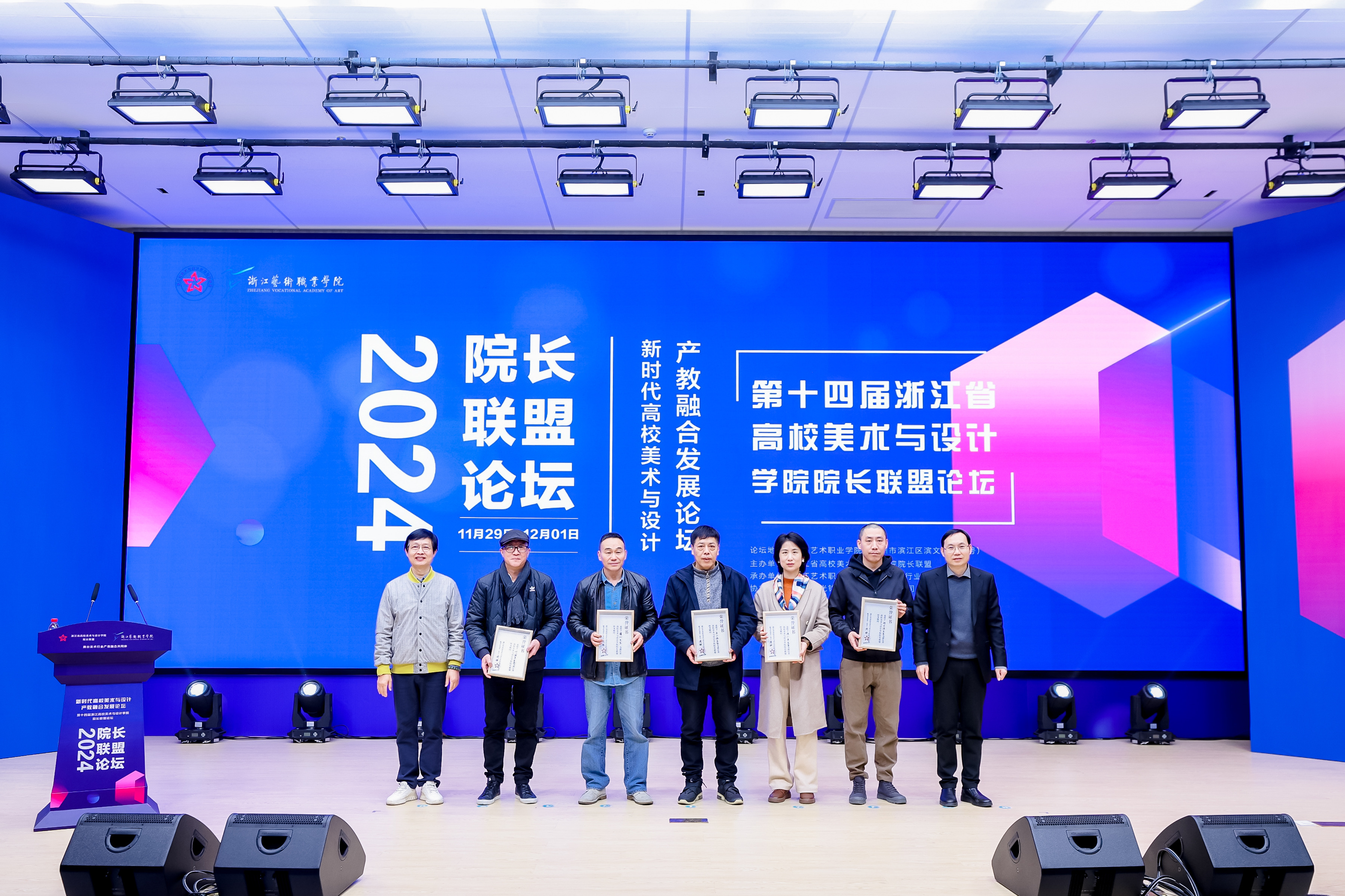 浙江艺术职业学院校长施俊天,联盟秘书长周斌为5位院长颁发联盟终身顾问荣誉证书