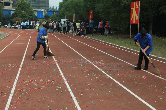 是谁?让今天的运动场在结束一天的比赛之后,仍然保持最初整洁的样子。是我院身着蓝色工作服的保洁员们,哪怕是在运动会比赛期间,他们也不忘自己的身份和工作,默默出现在运动场上的各个角落,清理赛场。最晚离开运动场的也是他们,因为他们要让我们的操场保持原貌,好让明天迎接全院师生的是别样的好心情。他们的对工作的认真负责,让人深深感动。