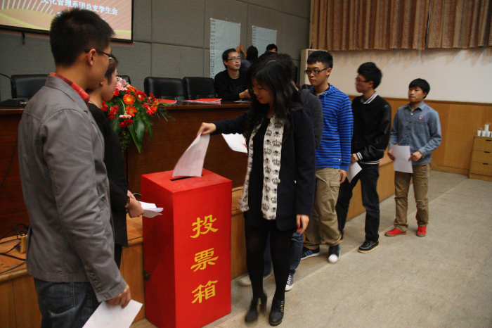 在紧张、谨慎的投票选票过程中,参加选举的同学纷纷上台表演来缓解紧张的气氛,周逊深情献上一首《再见了我的爱》引得在场代表的热烈掌声,11非遗班的邵悦为我们带来性感、动力十足的热舞,展现了文管系学生多才多艺的一面;团总支副书记郑金席和系辅导员胡海影为在场的献上一首《东方之珠》,胡老师优美浑厚的声音引来在场学生热烈的掌声;张永华和沈飞也为大家演唱了好听的歌曲。