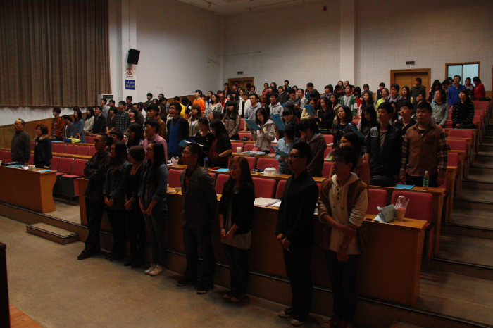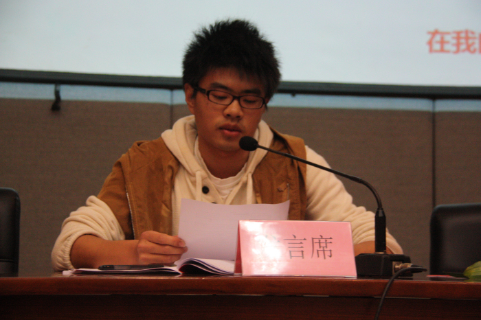 在激昂的国歌声中,大会正式开始。夏开堂对大会的顺利召开表示祝贺,并向文管系团干部、学生干部致以诚挚的问候。他对文管系的工作表示肯定与赞赏,也对文管系即将产生的团学寄予殷切的希望,希望新一届的团学代表能够继承发扬文管系的优良传统,学习老团学的好作风、好方法,在学生当中起到先锋模范带头作用,取得优异成绩;也希望在团学带领下,全系同学能够树立良好的系风、学风和工作作风。