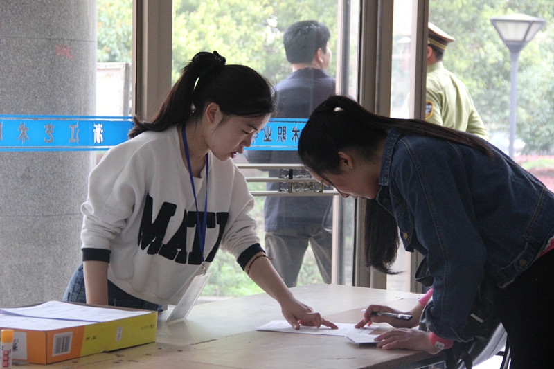 报考流程井然有序。工作人员在组织报考学生填写报名表,热情接待前来报考浙艺院的莘莘学子。