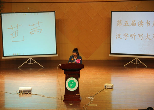 比赛紧张激烈,选手面对挑战,从容应答。随着题目难度地慢慢升级,部分选手开始被淘汰下场,为了能取得好成绩,台上的选手格外专心。整场比赛严肃活泼,富有趣味性而不失比赛的正规性,出题的文字虽然简单却带有混淆性,让选手在细节处容易吃亏,如“装裱”、“尴尬”,选手忽视了偏旁的细节,而未能发挥出正常水平,尤其“尴尬”一词还带来小小的争议,最后由裁判指出正确写法。本次比赛考虑到细节问题,还留心日常的学习积累,如“期颐”、“吝啬”等词,让在场学生在无意中收获知识。在严谨的统分工作后,出现四个并列季军,裁判组临时决定进行季军加时赛。四名选手通过简短激烈的加时赛,将整场比赛的气氛推向高潮。加时赛一开始就进入白热化状态,几位选手不分上下,比赛陷入胶着状态,最终,杜方方凭借微弱优势战胜其他三名选手成为季军。