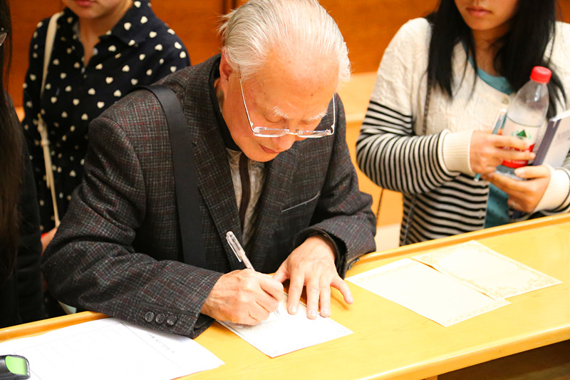 讲座结束后,热情的学生将薛家柱团团围住,纷纷要求签名留念,有些更希望能与他合影。薛家柱热情答应,还主动与学生作短暂交流。