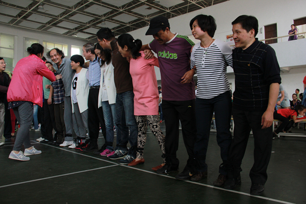 在激烈的绑腿走比赛中,显现出了教师的团结精神,他们是如此可爱。