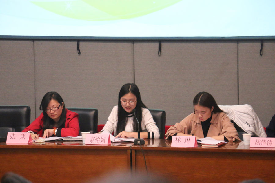 大会在庄严的国歌声中拉开帷幕。首先,由郑吟代表学院团委讲话,她对文管系第十一届团学一年来开展的工作和所取得的成绩给予肯定,对即将选举产生的第十二届新团学和文管系全体同学寄予了希望。接着,系团总支副书记林琳、张翔先后做了团总支工作报告,确定今后努力方向,要发展自我、明确自我、完善自我。系学生会主席赵怡媚在工作报告中分析了当下学生会工作中存在的缺点和不足,表达了对新一届学生会的期望。钱杏芬为即将上台竞职演讲的候选人送上祝福:“无论成功与否,只要走上讲台,就是成功。”