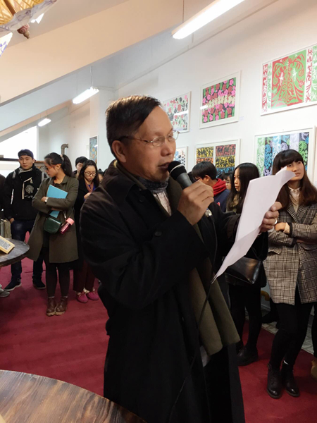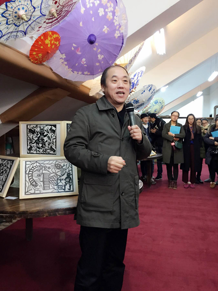 12月23日上午,文化管理系12级非遗班在八号楼九楼举行“非物质文化展览、保护、传承”毕业作品展。院党委书记林国荣、副院长朱海闵、副院长沈恒、文管系副主任(主持工作)陈子达等领导出席并参观了本次展览。