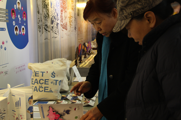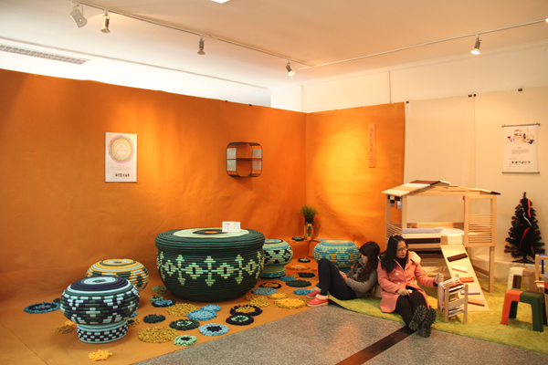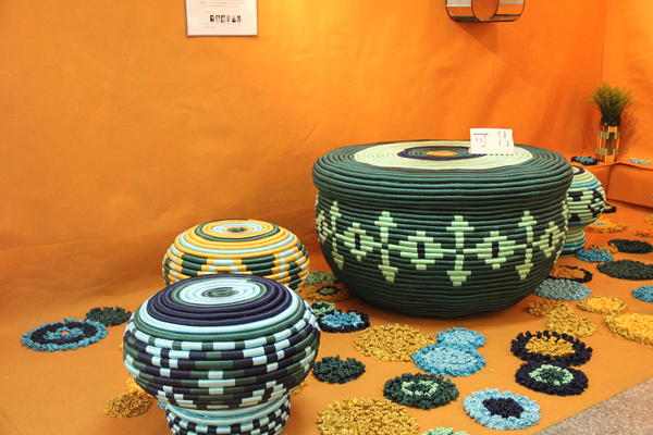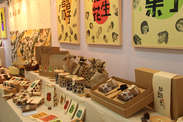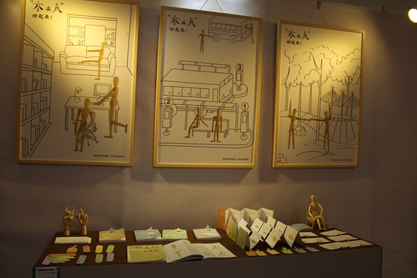 走进大厅,在明亮的空间里,左手边是家具和软装设计作品。色彩鲜亮、以年轮为造型的座椅与自然朴素的软装设计《麻居》形成鲜明的对比,艺术性的空间展示了别样的家居风格,原麻材料的运用更是提倡了环保理念。右手边,以蔬果为主题的包装设计朴素简洁,清新活泼,体现出“健康饮食,健康你我”的主题。将木头人的操作方法以一张张图展现出来的书籍设计《木头人动起来》和诗集《春江花月夜》的镂空部分等作品都各具特色。