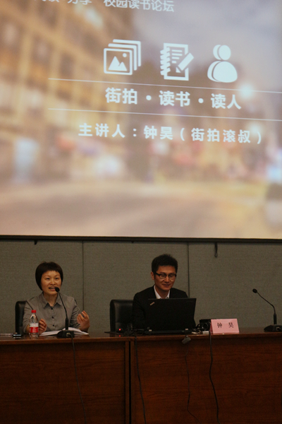 钟昊讲座的主题是《街拍·读书·读人》,与同学们分享了许多他从业至今在工作、生活中经历过的酸甜苦辣事。他说,其实街拍和读书是一样的,都是不断学习的过程。“会读书的孩子,一般气质都很好,气质好了,就可以被我记录下来了!”一番话引来全场大笑。接下来,“滚叔”又和大家分享了他拍的几组照片,讲述了每张照片背后的故事。在互动环节中,他告诉同学们:“阅读分很多种,书面阅读、新媒体阅读,还有就是在生活历练中的阅读。”在摄影的路上,他遇见过形形色色的人,在与人交流的过程中也收获了在生活中“阅读”的魅力:“在读书的过程中我也学会了怎样读人,现在我只要跟你说两句话,我就能知道你是什么样的人!”最后,“滚叔”希望同学们学会聊天和赞美,因为赞美会让人变得更美,聊天让阅读量变得越来越大。