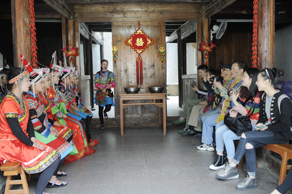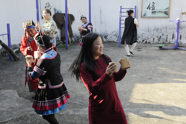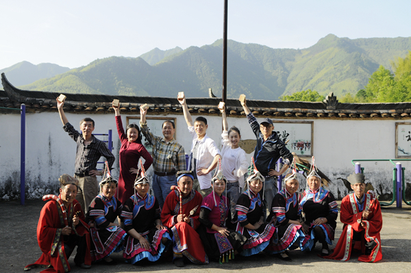 活动采用“真实体验”与“学习交流”相结合的方式。为真实感受畲乡风情,小组成员来到李宝畲族村,穿上民族服装,亲身参与大均婚嫁礼仪的全过程,对了喜歌、喝了米酒、跳进门舞、喝新娘奉茶,感受了特有的热情畲族民风。采风组现场倾听了景宁唯一国家非物质文化遗产传承人蓝陈启、市级非物质文化遗产传承人蓝仙兰的即兴畲歌演唱,并在东弄村欣赏到了由当地村民表演的原生态歌舞,收录了第一手珍贵的创作素材。采风组的舞蹈教师还和村民进行了互动,即兴表演了自编的畲族舞。