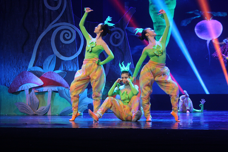 《胡萝卜星球》总共由“欢唱大丰收”、“真善美之风”、“悦舞胡萝卜”、“勇闯鲨鱼海”和“喜获幸福种”五幕组成,讲述了三只兔子为了兔子星球的未来不得已踏上飞往胡萝卜星球的旅程,去寻找七色种子最后梦想成真的故事。演出首先在“七色精灵,七色花”的翩翩起舞中开场。前两幕诉说着兔子族的丰收喜悦,也仿佛隐喻着13少儿音舞的同学们在大学生活中相互支持、共同奋斗的同窗之情;第三幕中,众多角色在变幻的灯光中展现出高超的舞蹈水平,赢得场下阵阵喝彩声,将整台晚会推向高潮。晚会最后,该剧总导演黄婧、莫非二位老师在一片欢呼声中登场,向观众致谢。