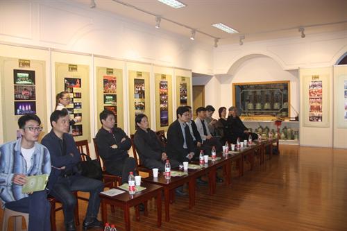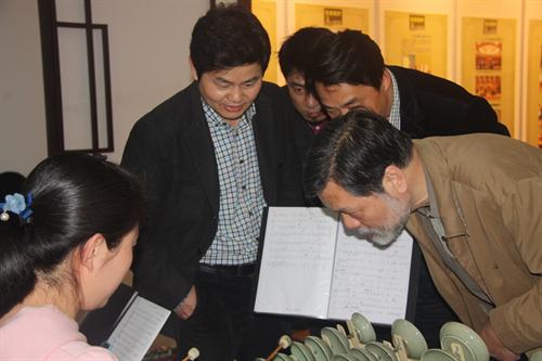 慈溪青瓷瓯乐艺术团团长谢杰锋等热情地向调研组来宾介绍了青瓷瓯乐艺术团的发展历程、近年来所取得的成果,希望能携手浙艺院将瓷乐文化发扬光大。艺术团的艺术家们现场演奏了瓯乐合奏曲《春晓》、瓯胡二重奏《窑工乐》等曲目,清脆的瓷乐声吸引了来自音乐系、科研处等调研组专家们亲自体会其中妙趣,饶有兴致地与演员们切磋交流瓷器的发声韵律。调研组一行还观看了青瓷艺术团近年来在国内外演出的视频,其独特的创作和精湛的演奏令人称赞。张建国表示,美妙的瓯乐需要大力传承和发扬,非常希望青瓷瓯乐艺术团能来我院演出,开拓学生们的视野,增进交流沟通。
