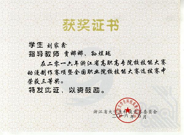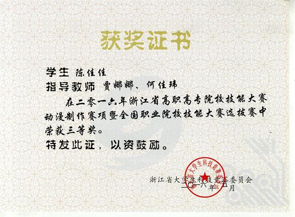 5月6日至8日,浙江省高职高专院校技能大赛动漫赛项在台州职业技术学院举行。我院美术系动画专业学生陈佳佳、翁雨桥和刘家鑫与来自全省众多高职院校的选手竞技,分获三等奖。