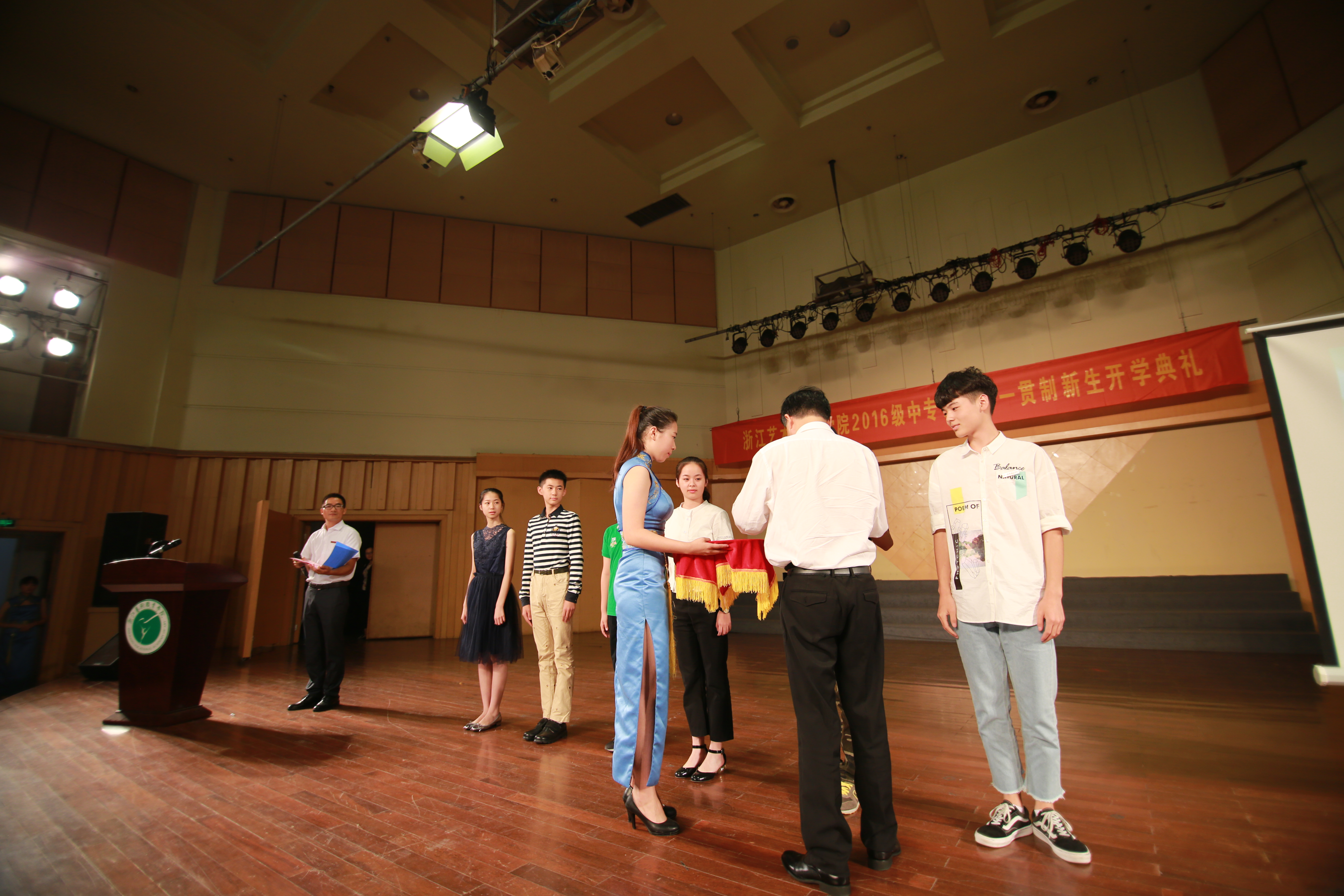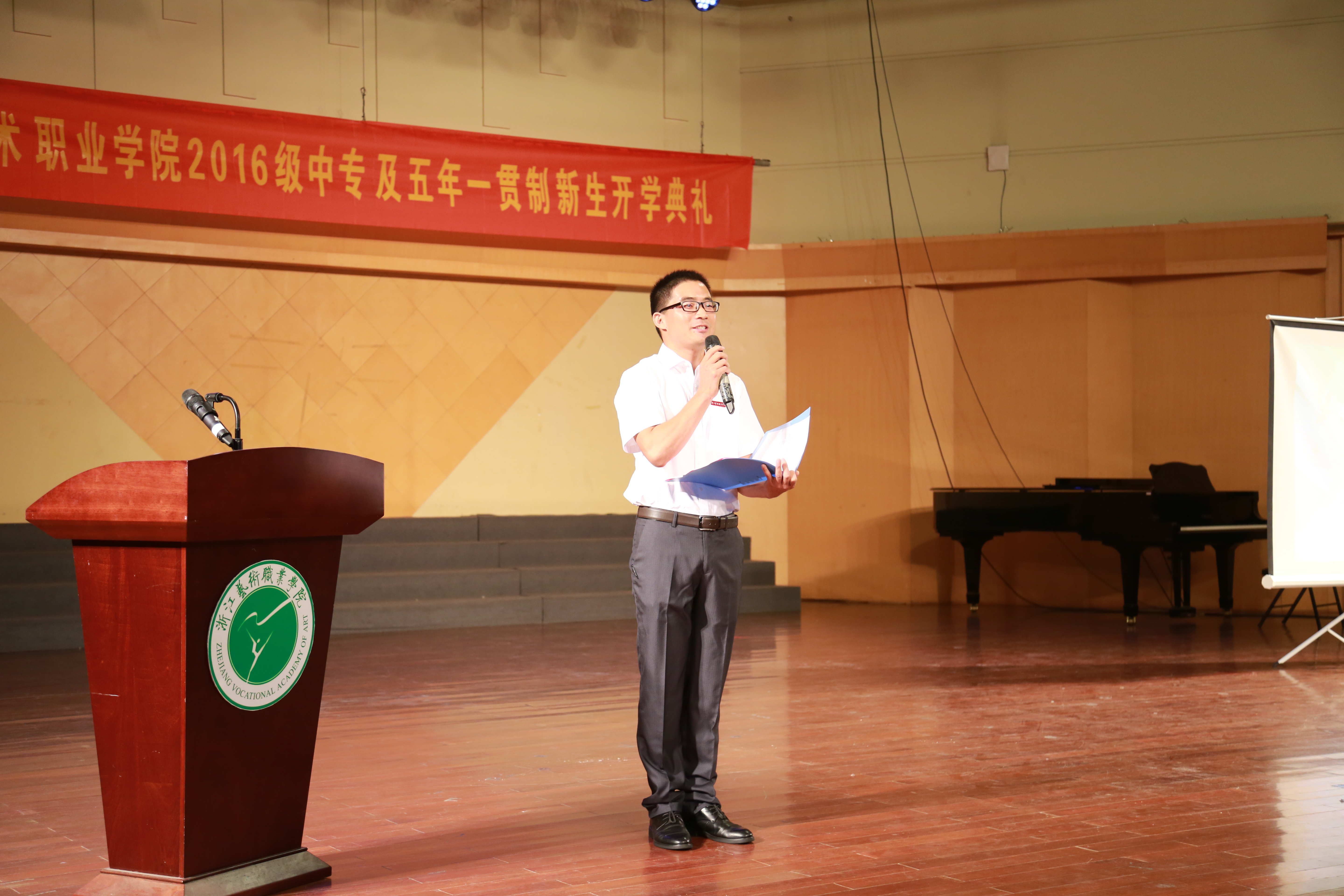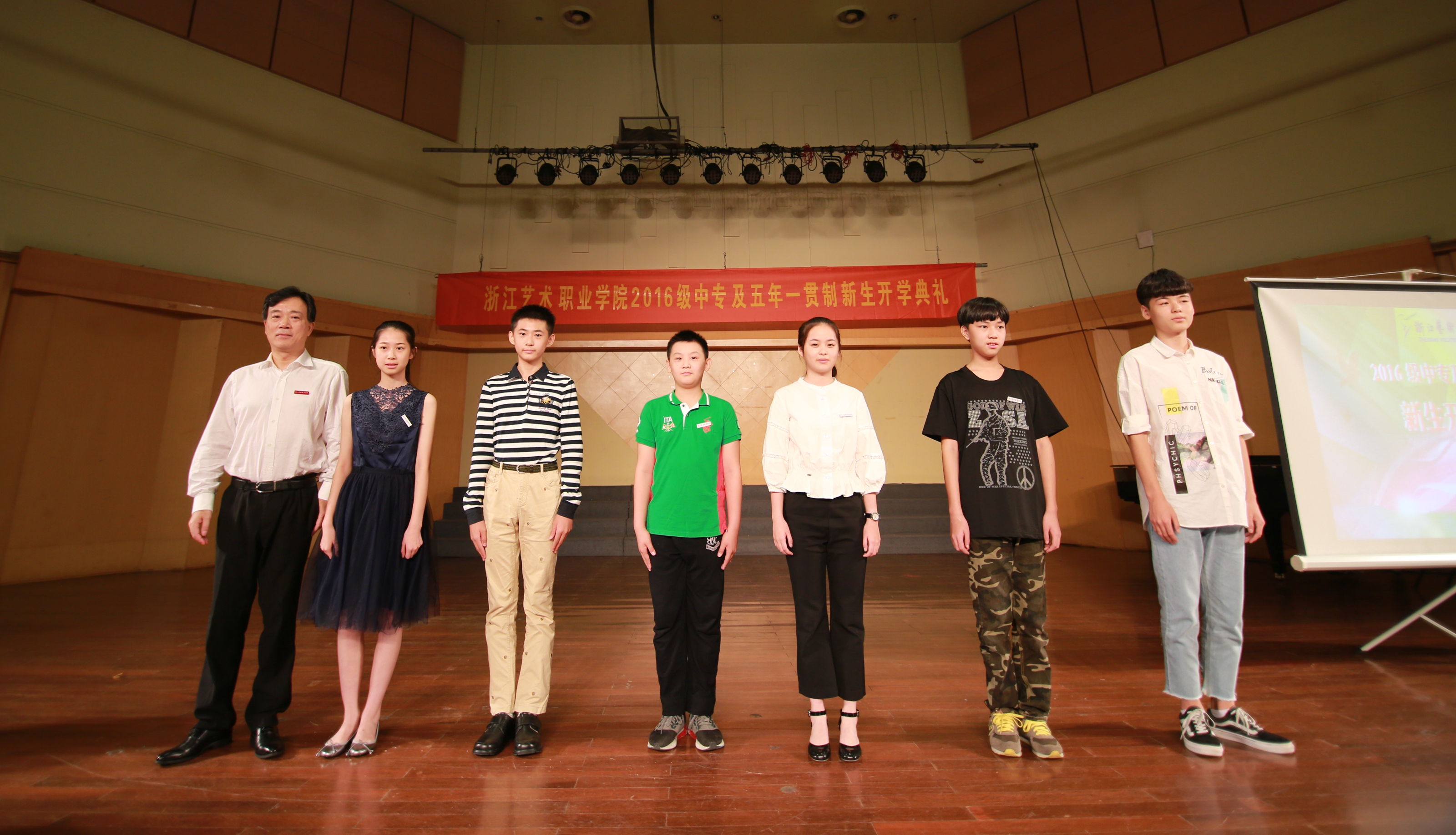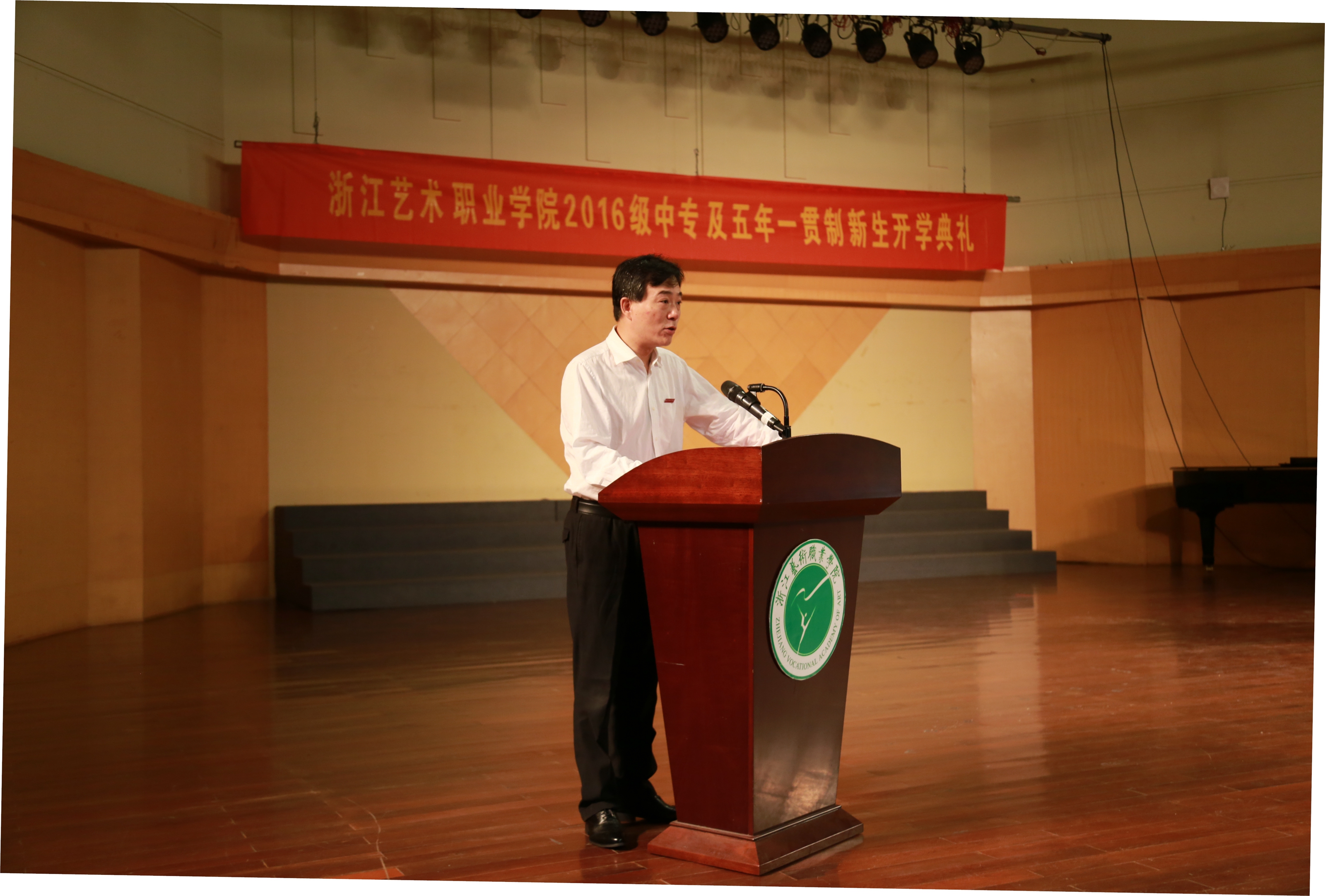9月20日上午,浙江艺术职业学院2016级中专及五年一贯制新生开学典礼在院音乐厅举行,343名新生到场参加,副院长沈恒及各系部负责人出席,典礼由学生处附中学生科科长刘梦伟主持。典礼在雄壮的国歌声中拉开序幕。同学们和老师们全体起立,齐唱国歌,嘹亮的歌声响彻整个音乐厅。