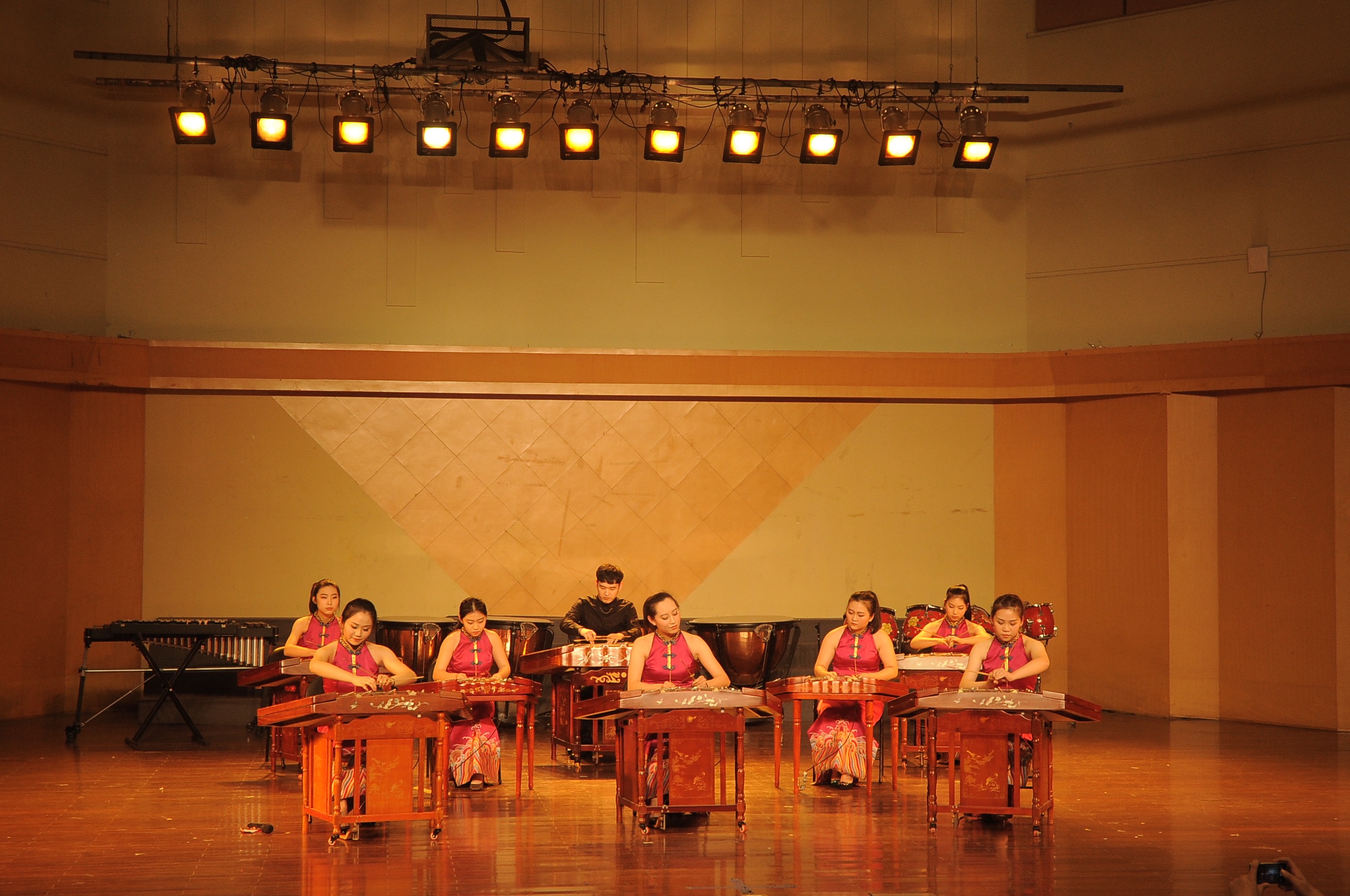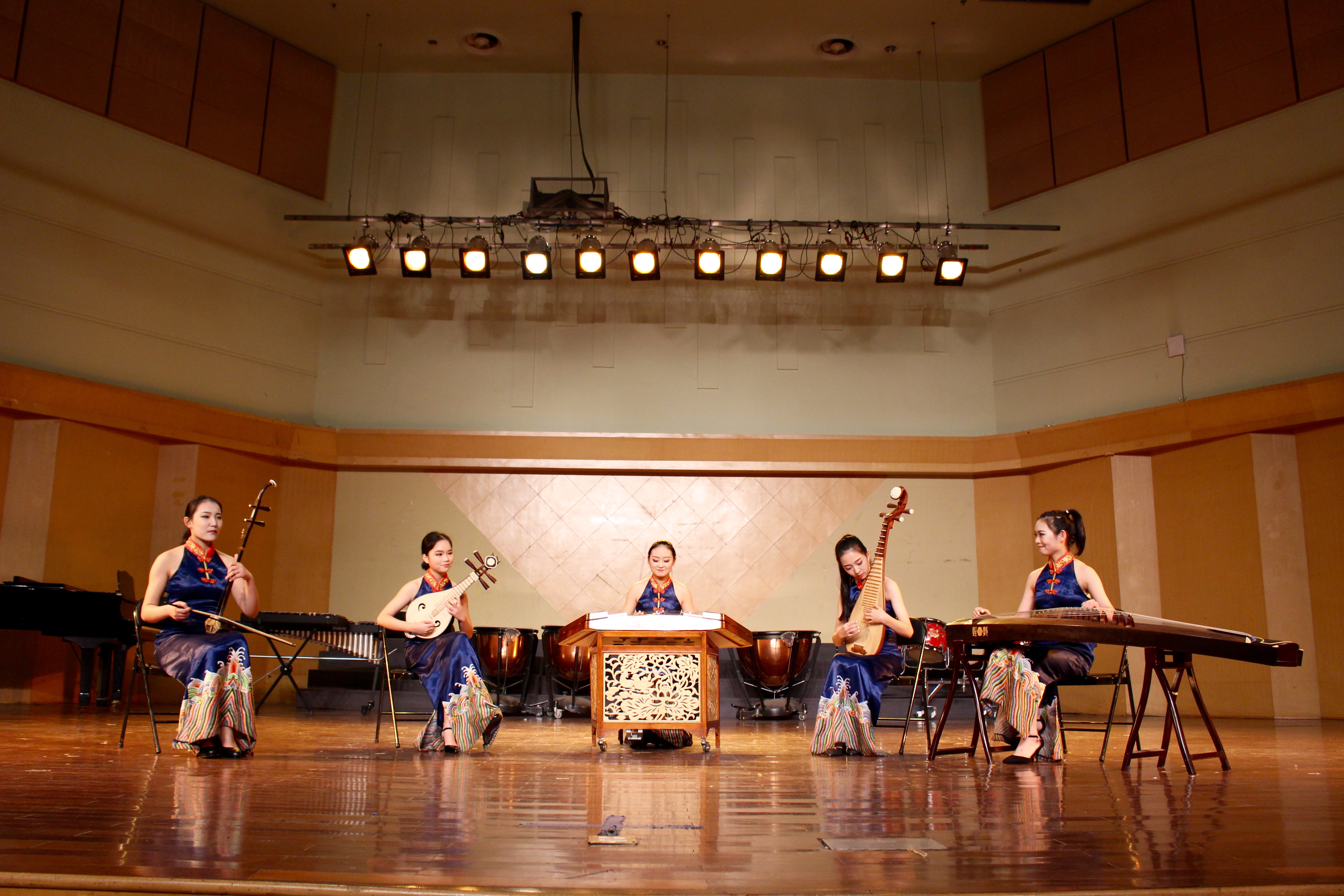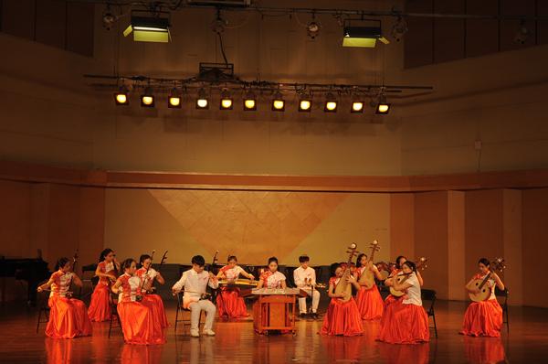 音乐系民族管弦乐团带来的具有浓厚民族特色的开场曲《节日》描绘出云南各民族人民共庆节日的热闹场面,音乐抒情而优美,沸腾而热烈。紧接着的《赶街》用明快优美的旋律和层次清晰的配器,形象地描绘了苍山洱海之间“赶街”的生动画面。扬琴重奏《乡村·善水》取自扬琴重奏曲《乡村抒怀》和《甲午善水》两首作品的精华,曲调优美抒情,抒发了具有乡村音乐风格的人文情怀,描述了浙江省五水共治的场景。该重奏组曾获2016年全国第三届扬琴大赛专业重奏组银奖、第三届国际香港音乐节重奏组一等奖。指跃弦上,音嵌弦中,曾荣获浙江省“新松计划”器乐大赛铜奖的音乐系民乐班赵雨舟同学带来了中阮独奏《中阮第二协奏曲》,此曲的演绎需要运用独特的表现手法将中阮演奏技巧发挥到极致,赵雨舟同学用自己所学带给了我们美的享受。小调悠扬,纤指轻拨,丝弦五重奏《欢乐的夜晚》《跃龙》将中国民族丝弦艺术发挥得淋漓尽致,同时借有西方重奏的技巧特点使得乐曲更具艺术感染力。弓弦乐团带来的《病中吟》将乐曲分为三个乐段和一个尾声,将悲愤激昂之情寓于之中,感染着观众的内心。新苗江南丝竹乐队用丝竹风情演绎了《绿野》,此曲创作1987年,曾获1987年“第一届海内外江南丝竹创作与演奏比赛一等奖”。丝竹的悠扬之音,生动地表现了江南水乡美丽风光以及冬去春来万物更新的景象。