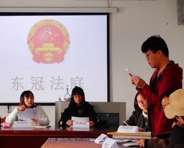 12月2日,国家宪法日来临前夕,文管系模拟法庭实训在东冠校区文管专业教学实训室举行,本次模拟法庭共有3场,15级文管班全体学生为现场评委,审判现场激烈而不失文雅,同学们形象生动地模拟着法庭中的角色。审判完全按照法庭审理的程序进行:开庭、法庭调查、法庭辩论、被告人最后陈述、评议宣判。