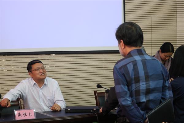 提问互动环节,科研处教授施王伟、周立波向朱恒夫提出了专业性很强的问题,他均予以细致独到的回答。由此,他还提到了有关中国戏曲文化传承与保护的问题。他说,在社会多元化发展的进程中,人们一昧崇洋媚外,传统戏曲的受关注度越来越低,如何保护传统戏曲文化及其发展已成为今后的一大题。借此,朱恒夫呼吁大家关注并传承保护中国戏曲文化。