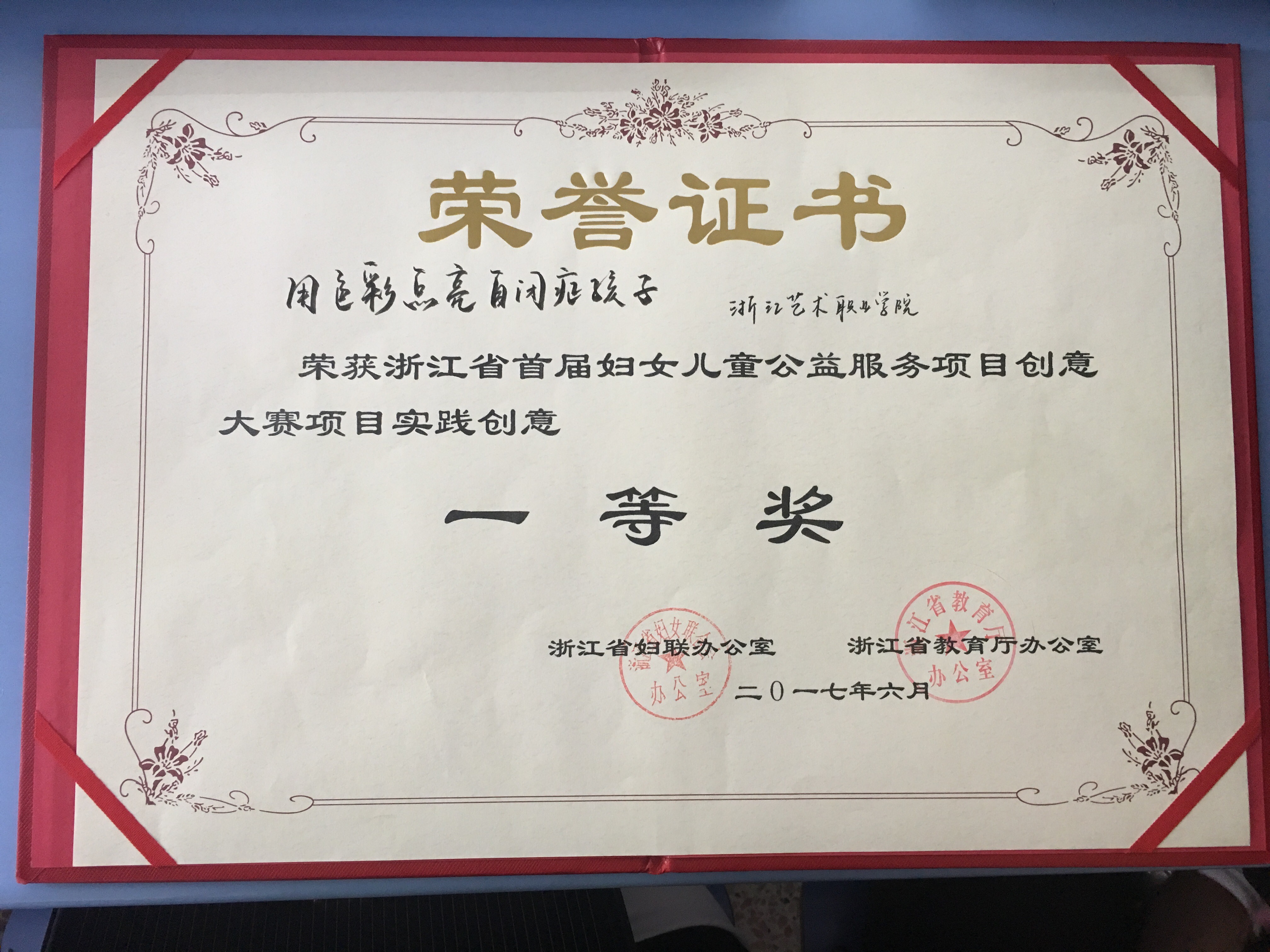 近日,浙江省首届妇女儿童公益服务项目创意大赛落下帷幕,浙江艺术职业学院美术系动漫设计专业何佳玮老师带领的“小太阳”团队的参赛项目《用色彩点亮自闭症儿童》从全省50所高校参赛团队提交的381份项目申报书中脱颖而出,获得一等奖。