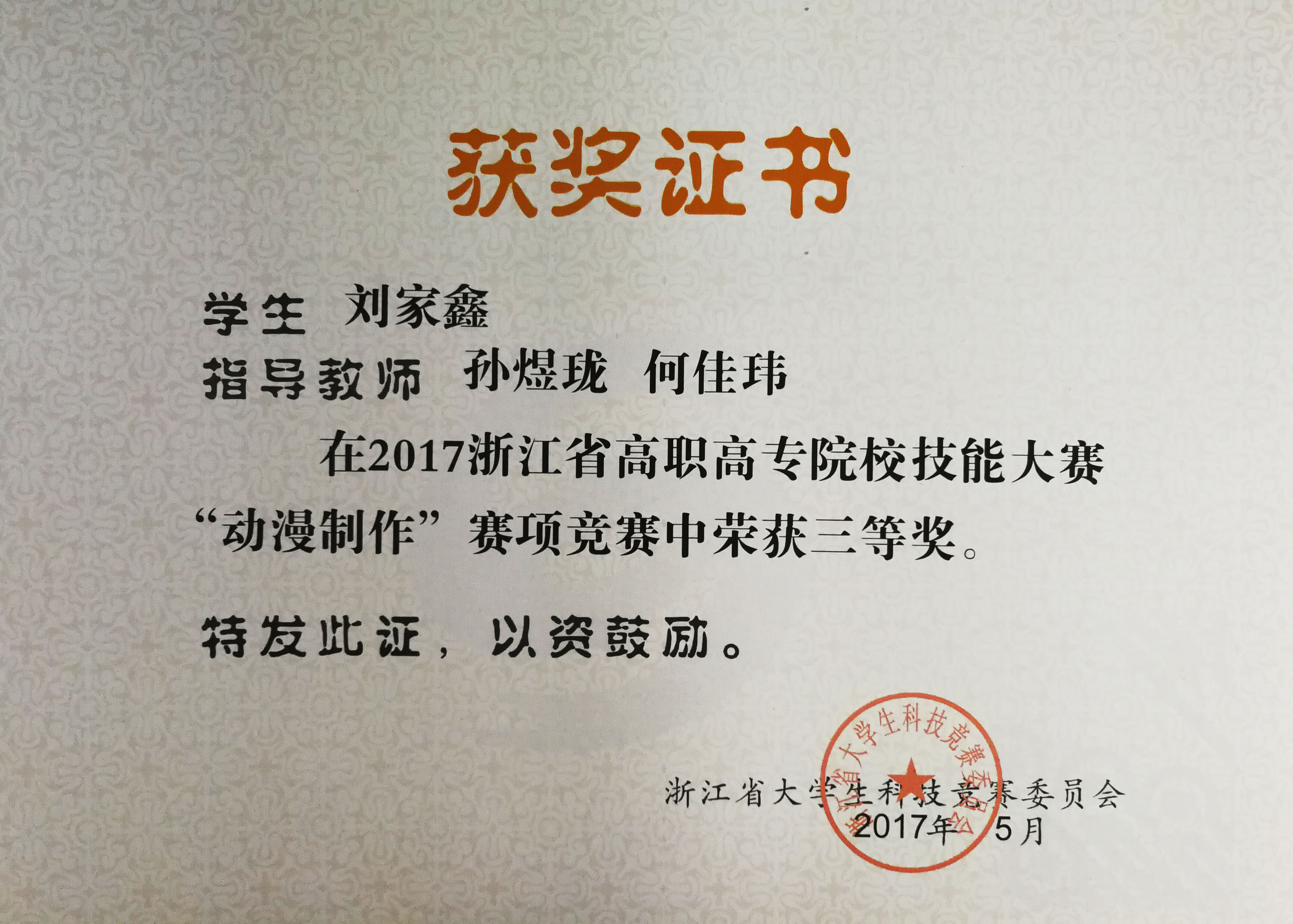 近日,由浙江省教育厅主办的2017年浙江省高职高专院校技能大赛“动漫制作”赛项竞赛在浙江纺织服装职业技术学院落下帷幕。浙江艺术职业学院美术系动漫设计专业学生刘家鑫、郑晨怡同学分获三等奖,黄月娇同学获优秀奖。