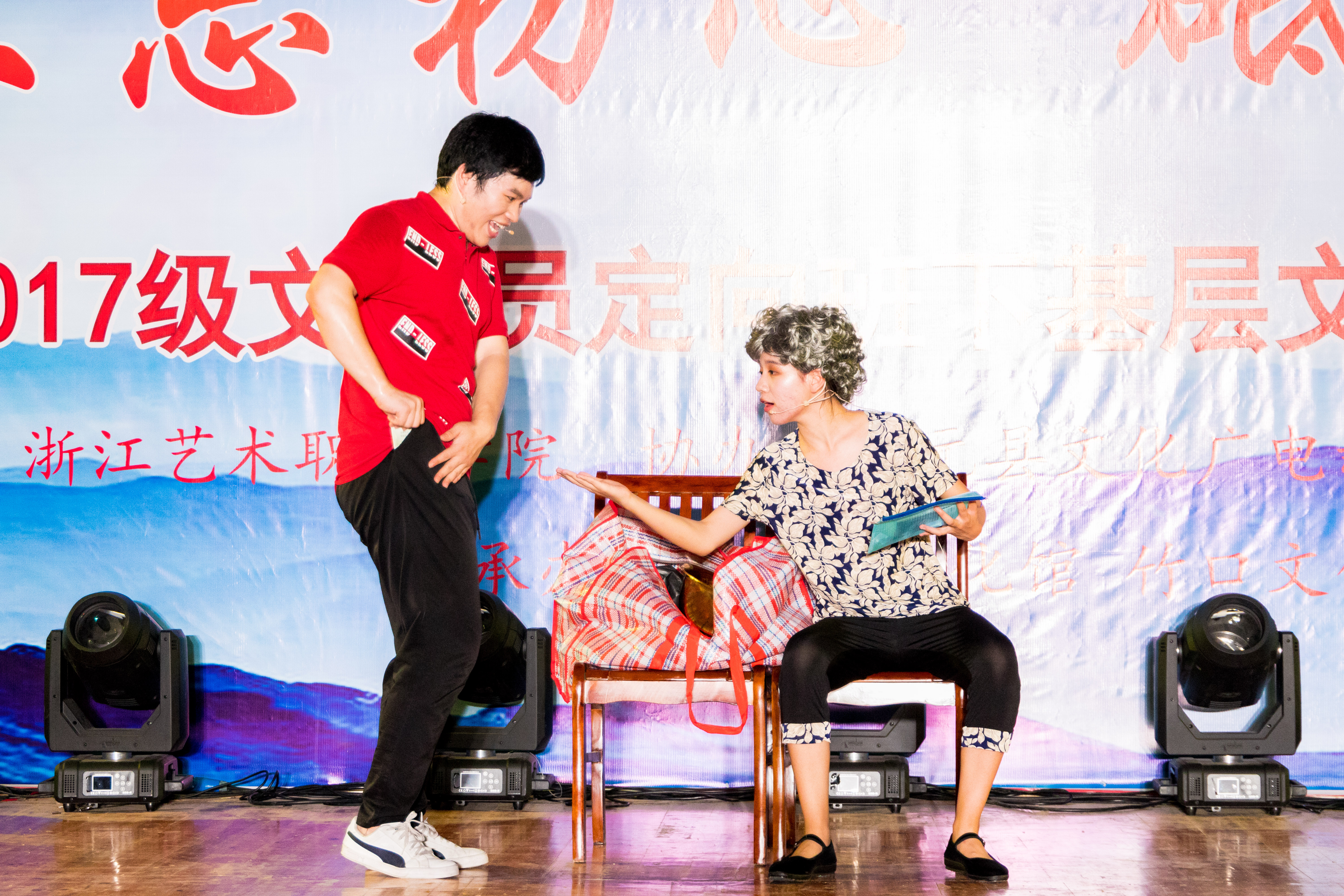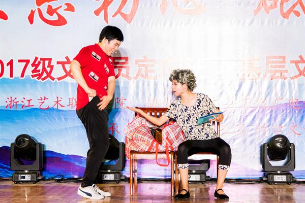 7月16日晚,伴随着观众席上的热烈掌声,浙江艺术职业学院2017级乡镇文化员定向班走进文化礼堂汇报演出完成了在金华的最后一场演出,圆满落下帷幕。自7月9日起,我校2017级乡镇文化员定向班走进文化礼堂汇报演出便在丽水市庆元县黄田村正式开启。本次汇报演出紧密围绕党的十九大精神,以“不忘初心,砥砺前行”为主题,为当地百姓带去了小品、歌曲、舞蹈、快板等多种表演形式的节目。7月9日至18日,学生们先后在丽水庆元文化礼堂、庆元一号码头、温州龙泉文化礼堂、泰顺泗溪镇文化礼堂、泰顺司前镇文化礼堂、金华横店圆明新园多地开展演出活动,为百姓群众送去了丰富多样的文艺节目。