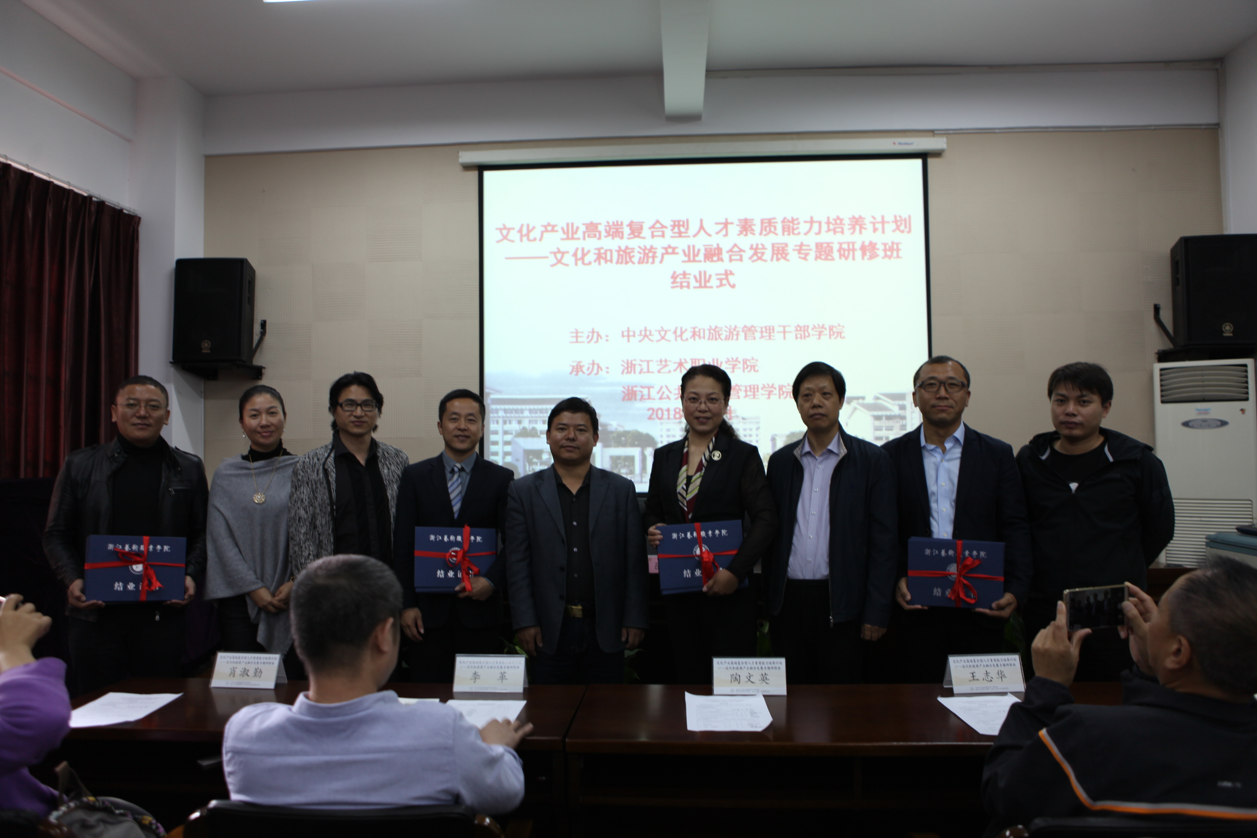 10月21日,由文化和旅游部产业发展司、中央文化和旅游管理干部学院主办的文化和旅游产业融合发展专题研修班开班仪式在全国文化干部培训基地浙江艺术职业学院(浙江公共文化管理学院)举办。64名来自全国各省、自治区、直辖市、新疆生产建设兵团、各计划单列市文化行政管理部门产业处负责人、相关文化和旅游企业负责人参加本期研修班。文化和旅游部产业发展司李学斌、浙江省文化厅产业处处长钱剑力、浙江艺术职业学院院长黄杭娟参加开班式。