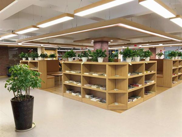 步入图书馆大门,新布局很小清新,色调柔和,大厅西角落多了一个小咖啡座。中心区的绿萝为大厅增添了勃勃生机。一定要关注大门左侧的电子屏哦,那里连着超星图书馆,学校已经付费,扫码就可以直接下载电子书。还有更方便的,图书馆老师说,超星移动图书馆只需绑定校园一卡通,扫码也可下载免费的电子书。右侧报刊新书阅览室已经改造完成,新书可以外借,报刊仅供现场阅览。