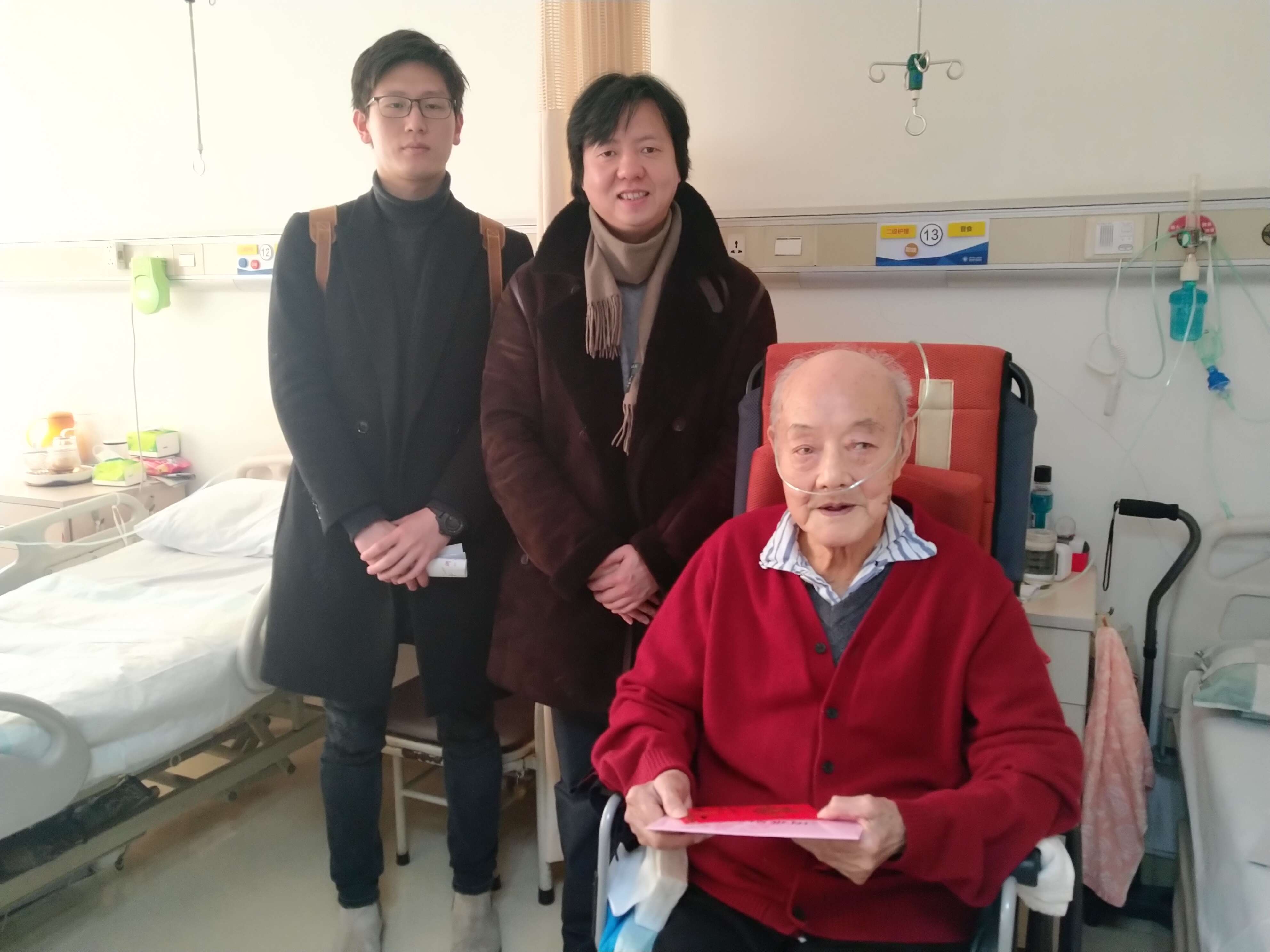 1月18日上午,美术系党总支副书记、副主任孙煜珑与系辅导员龚林峰赴浙江省人民医院看望我校离休干部陈玉祥。陈老先生现已97岁高龄,女儿一直在身边照顾起居。