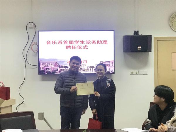 为了更加扎实做好入党申请人员培养工作,发挥学生党组织战斗堡垒作用,促使学生党员、入党积极分子、入党申请人积极参与学生党支部培养、考察、发展党员全过程,充分发挥榜样的引导作用,音乐系设置学生党务助理工作办公室,选聘了首批学生党务助理。1月4日下午,首批音乐系学生党务助理聘任仪式在系党员之家召开。音乐系党总支专职副书记谢志勇为6名学生党务助理颁发聘书,音乐系学生党支部书记主持聘任仪式,学生党支部全体党员、入党积极分子参加仪式,首届党务助理办公室主任、首席党务助理发言。