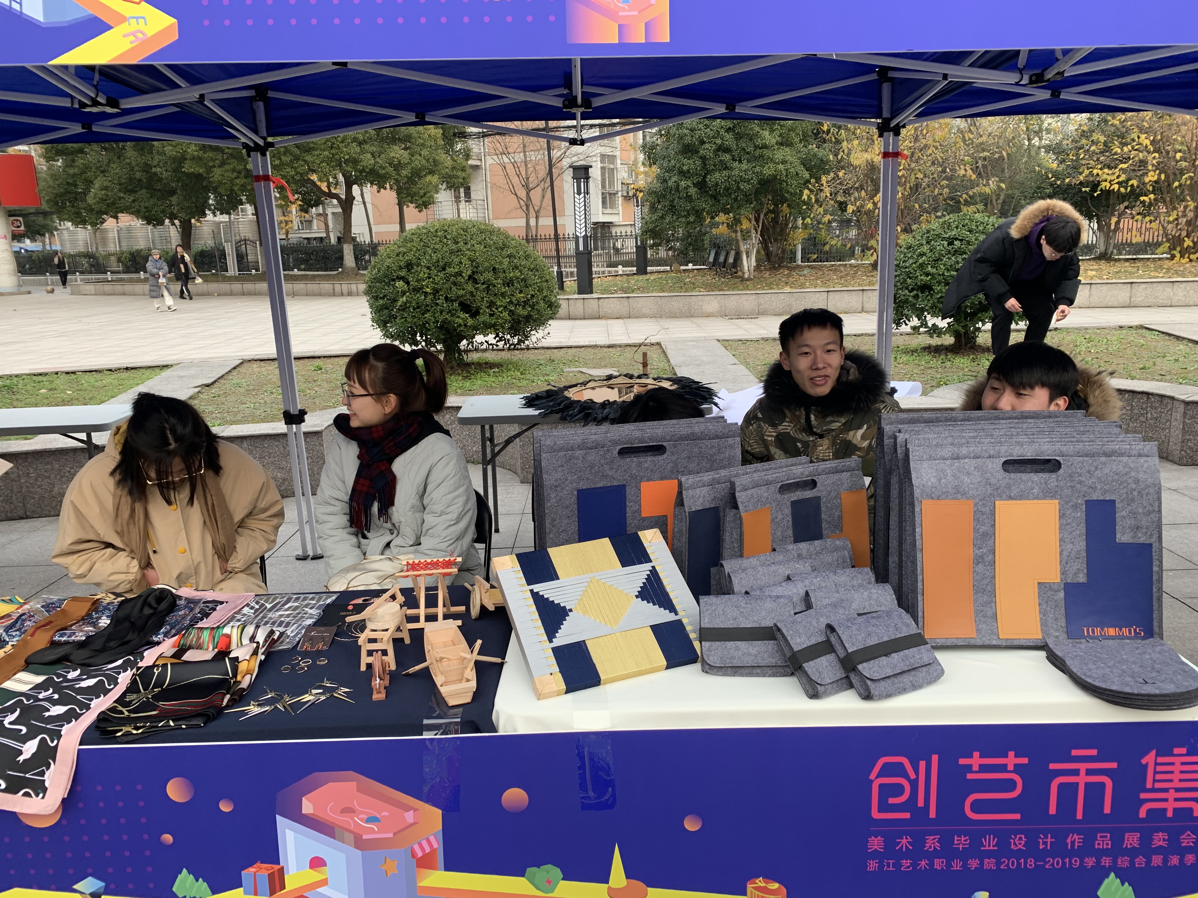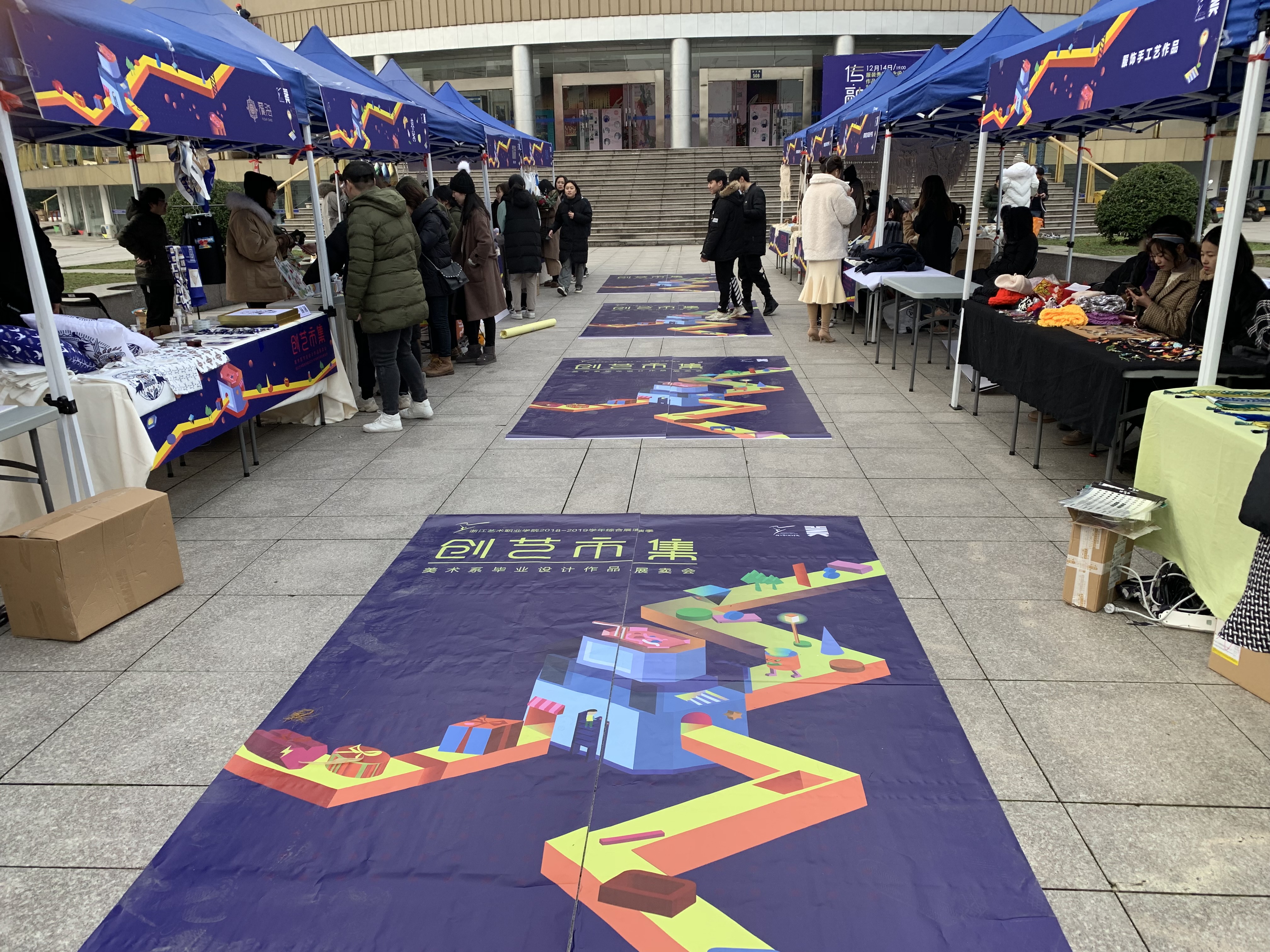 2018年的最后两天,浙江艺术职业学院学生创业园门口(实验艺术剧场前广场)横空出现了一个市集,广告创意产品、动漫衍生产品、装饰艺术作品、服饰品定制等琳琅满目,吸引了来往行人驻足欣赏、采购。大大的彩虹气球上写着“创艺市集”,这正是今年浙艺美术系2019届毕业作品展之后的二次创意——将面向市场实际需求的原创作品直接推向市场,让同学们更深刻地体会作品到产品的转化。