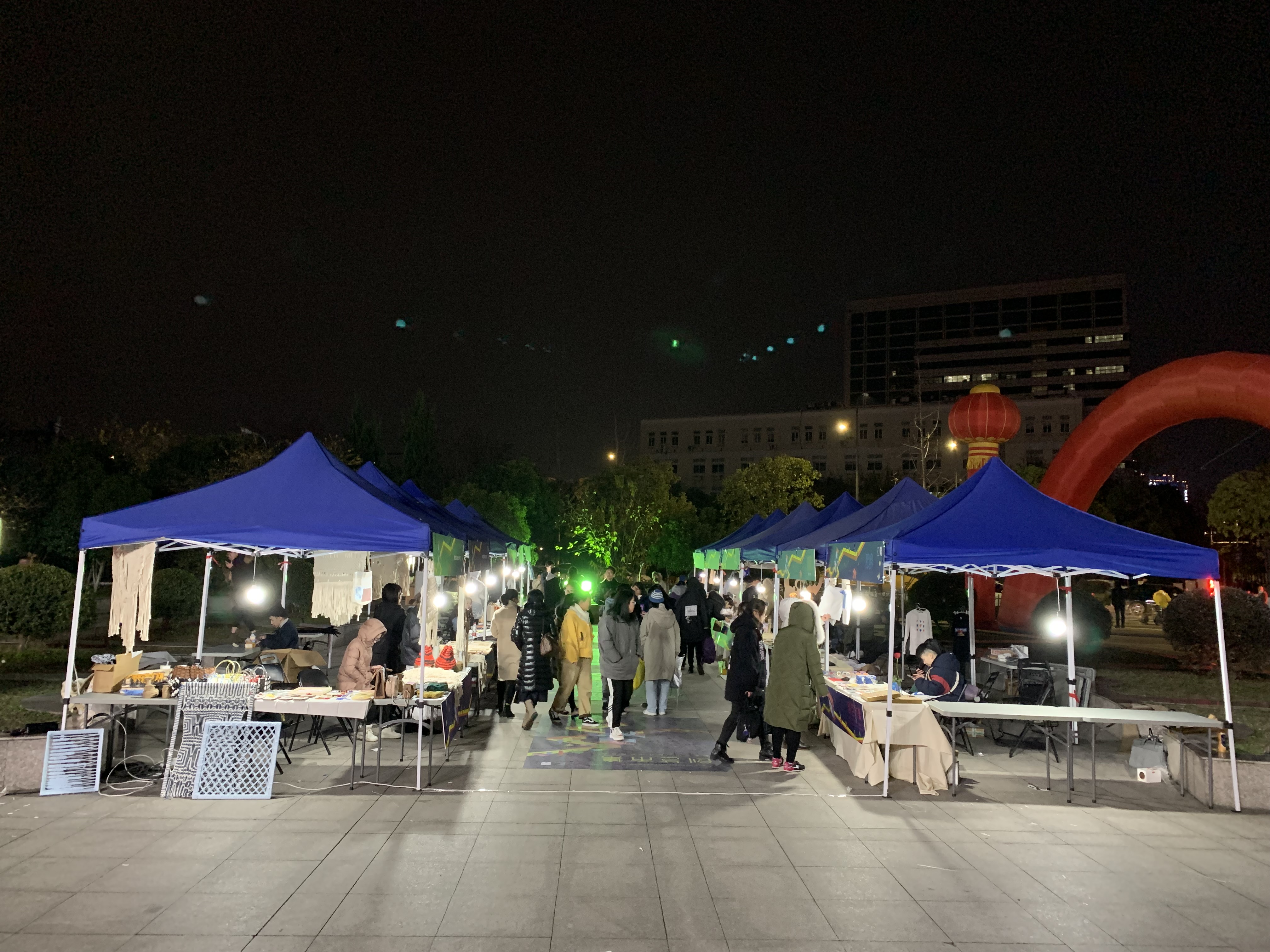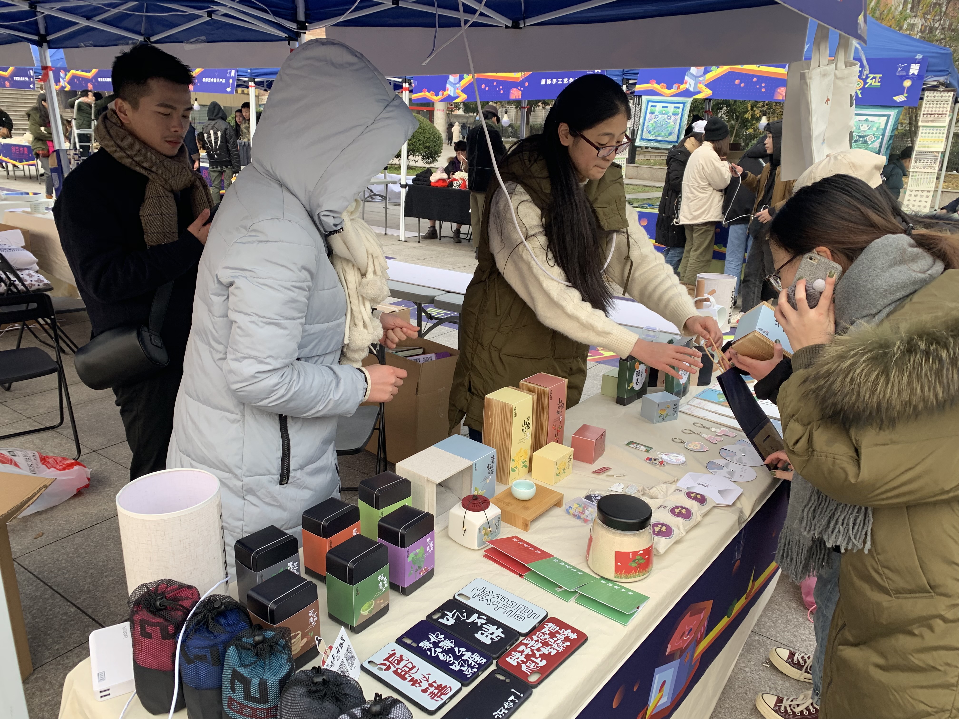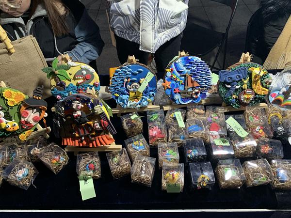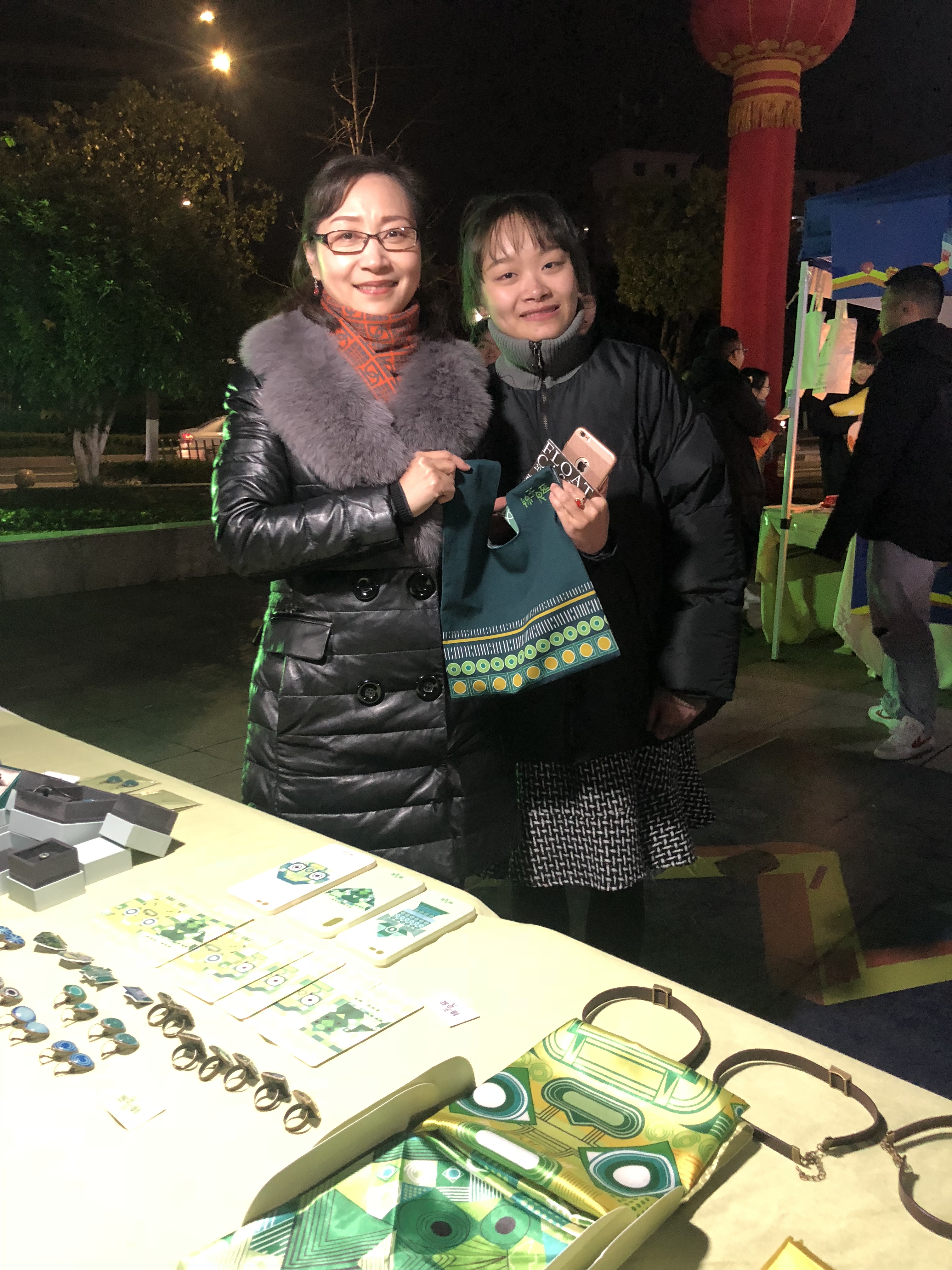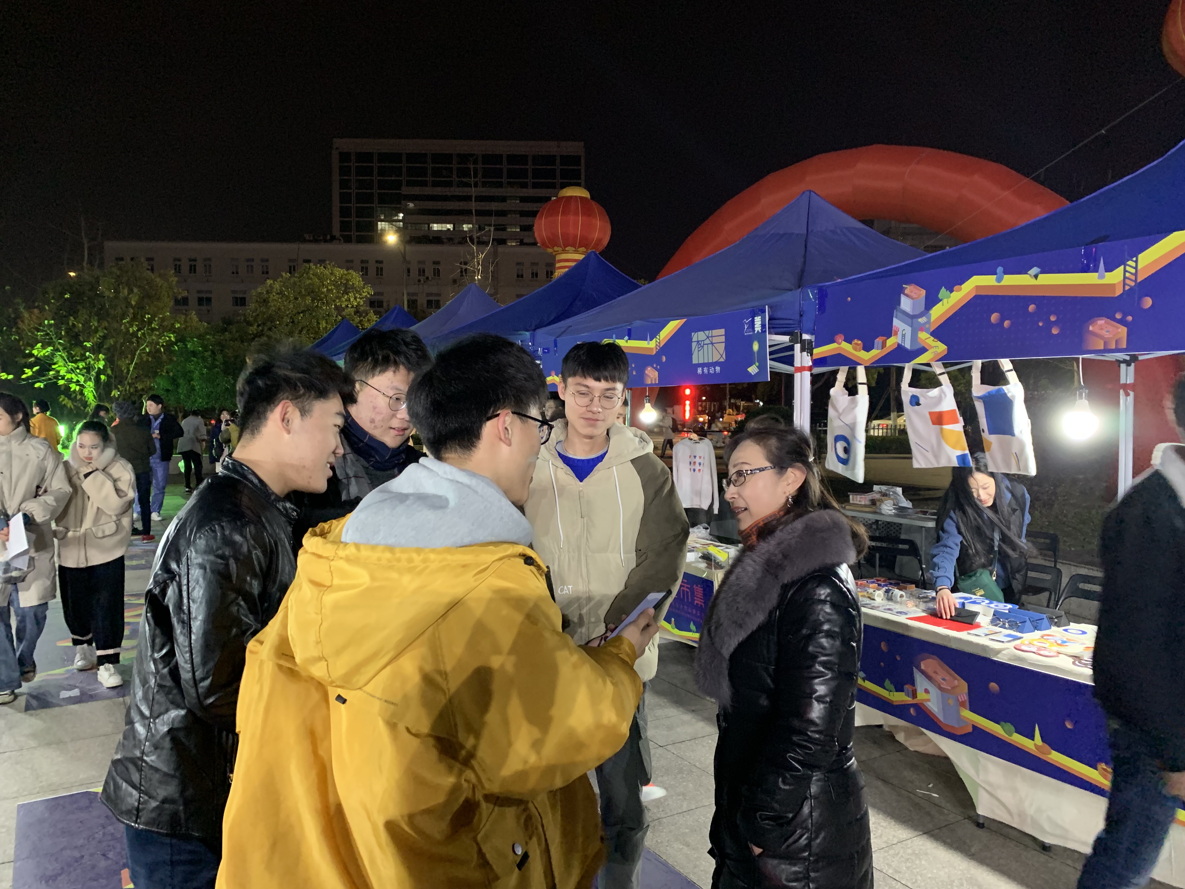 走进红色的“彩虹门”,便能看见那摆放在摊位旁的“小胖子”。这一处是广告创意产品,主题是“变形记”,展卖的有红色小胖子形象的贴纸、文件袋、健身日记、水杯等,创作者们介绍,这个设计是想要大家树立科学减肥,科学健身的理念。现场还能参与中奖机率较高的抽奖活动。“天绮咏古” “覆海”两组产品的灵感来源于敦煌壁画,设计者们希望年轻人能更多地喜欢中华传统文化,产品有抱枕、帆布包、红包等等。带着水果图案的手机壳、钥匙扣、眼罩、闹钟、水杯等“弄器”系列创意产品,旨在将健康知识传递下去,呼吁大家珍爱生命,养护器官,从年轻开始。“良渚玉器”摊位展卖的小首饰、手机壳、丝巾、抱枕等各类小产品精致美观,也有不少人购买。动漫设计的主要产品衍生于一部动画,有饰品、卡通人物、小场景、手提包、小布袋、动漫人物等。环境设计摊位是大家亲手织的围巾、帽子,编织的手提包、手环,样式精美,别出心裁。天气有些冷,可既是创作者又是零售商的同学们热情不减,向来往的人们推介着自己的产品。入了夜,创艺市集点亮了灯,有满载而归的买家,有热情似火的卖家,热热闹闹。学校领导、老师们也纷纷到市集里“淘宝”,支持同学们。