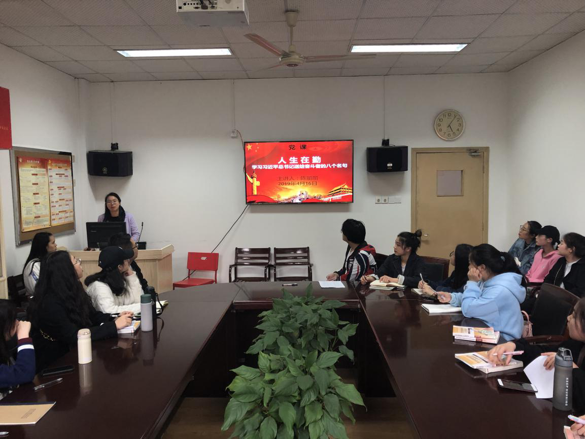 4月16日,音乐系学生党支部书记陈丽丽为学生支部党员、学生入党积极分子上党课。她以“人生在勤”为题,带领全体与会者学习了习近平总书记送给奋斗者的八个名句。她表示,一年之计在于春,春时不忙秋来叹。成功属于勇于拼搏和奋斗的人。希望大家撸起袖子加油干,牢记习近平总书记引用的八句古典名句,勤于耕耘,多有收获,争取更加优异的成绩。