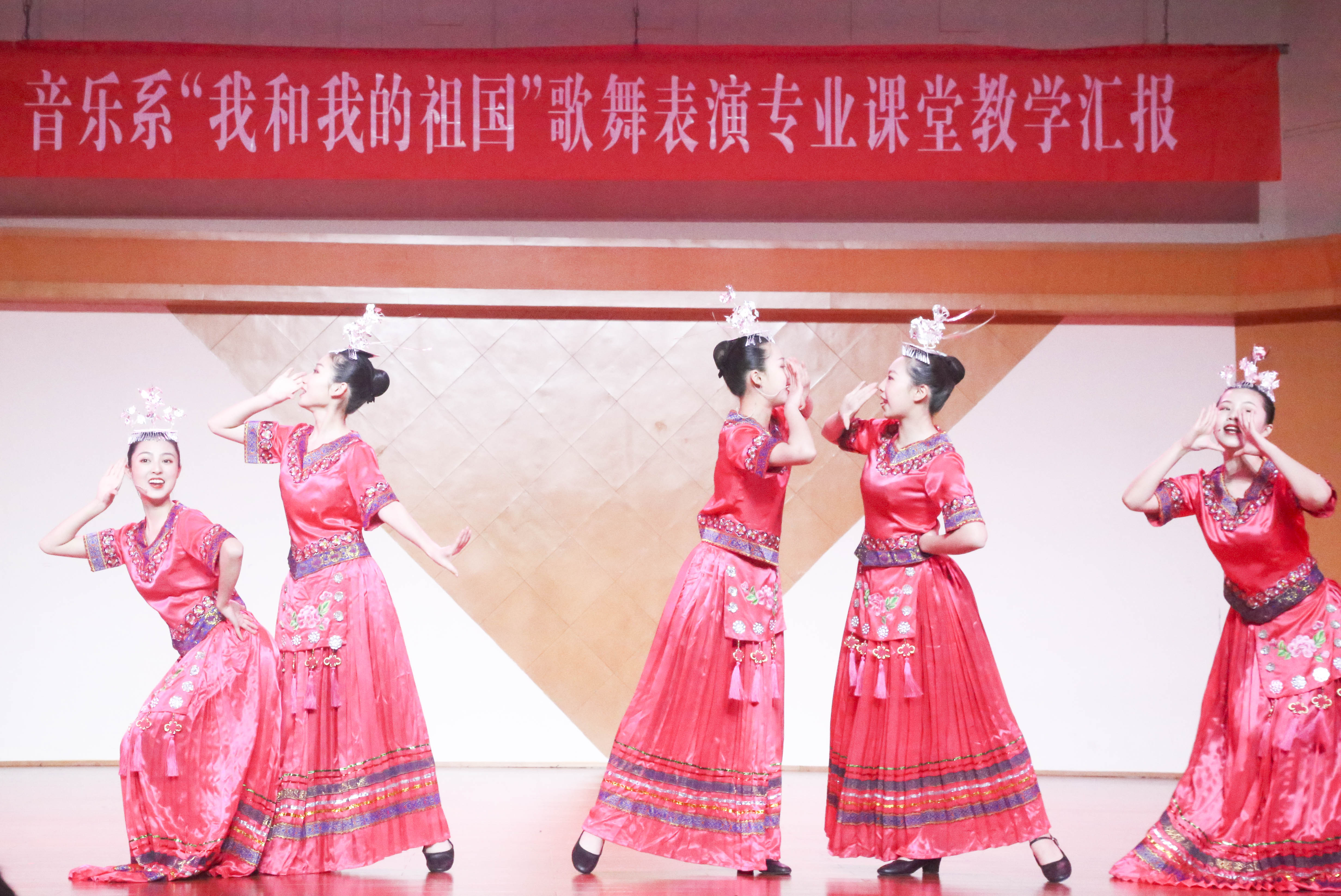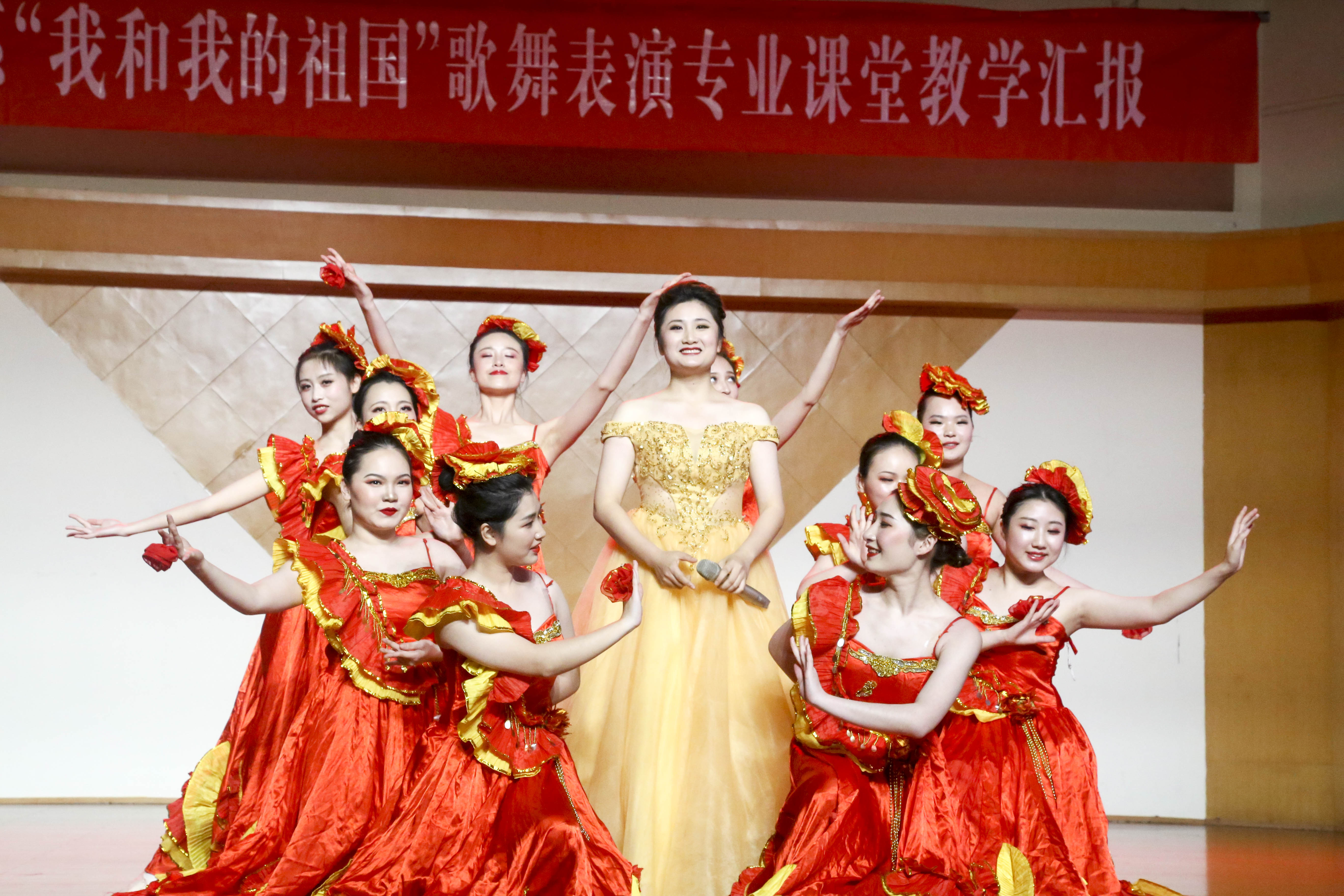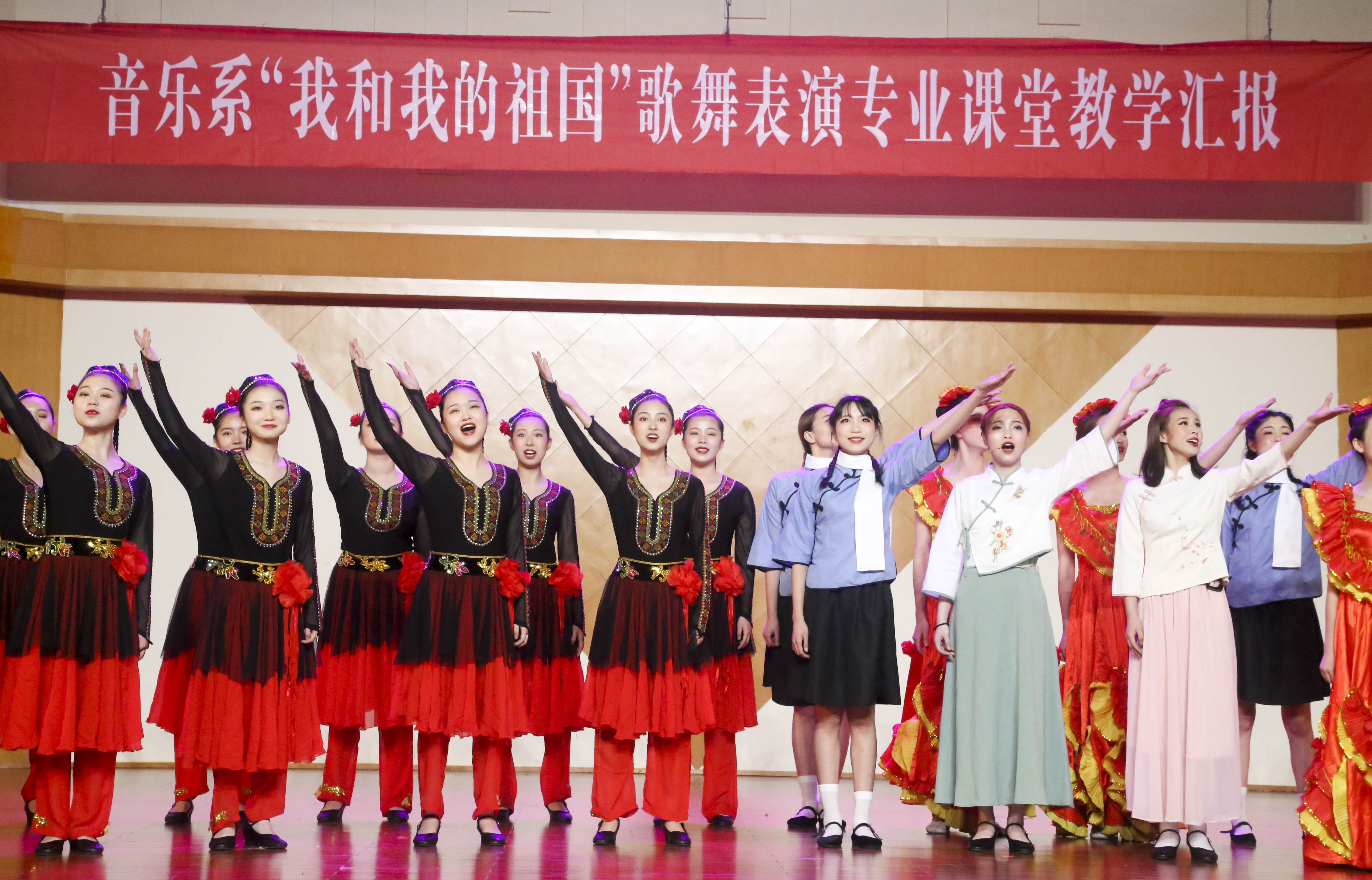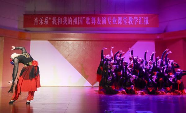 歌舞庆盛世,献礼70年。为献礼新中国成立70周年,颂扬心系祖国的爱国情怀,弘扬和传承中华民族文化,丰富校园文化生活,展现音乐系歌舞表演专业教育教学成果,4月15日,以“我和我的祖国”为主题的歌舞表演专业课堂教学汇报在学校音乐厅上演。校党委书记朱海闵莅临汇报演出现场,音乐系16歌舞一贯班、17歌舞大专班全体学生担当主演,音乐系师生代表两百余人观看演出。