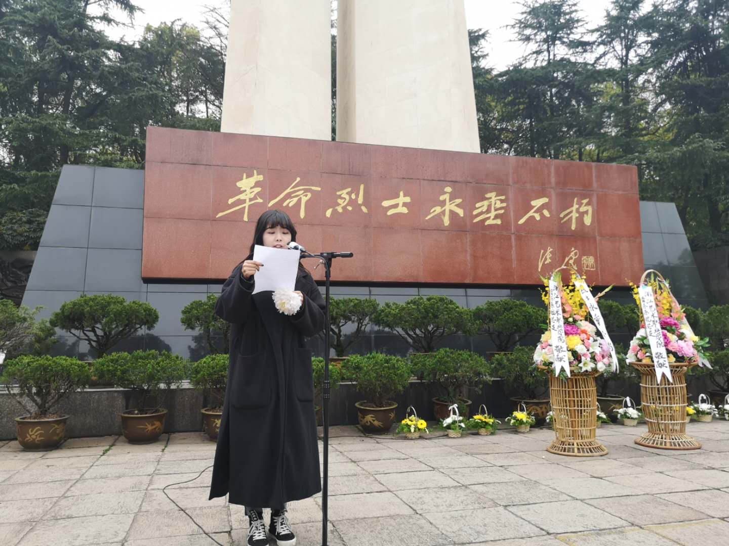教师代表汪奕楠宣读悼词。她说,虽然不能一一讲出先烈们的姓名,但他们一定是最可亲可敬的人,是父母心中最爱的人,是我们敬重与爱戴的人。人民不会忘记,我们不会忘记,国家不会忘记,历史不会忘记,先烈们永垂不朽!