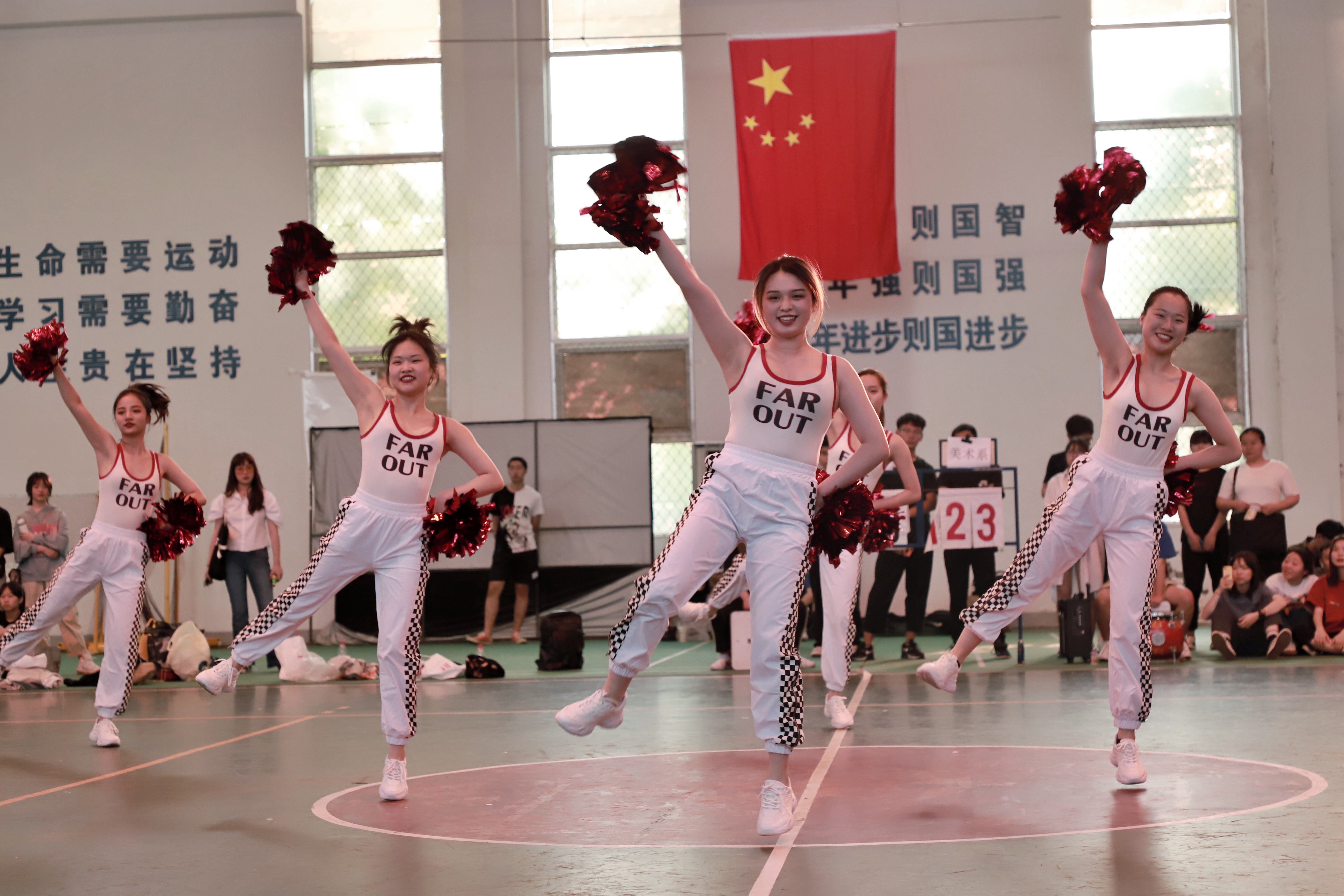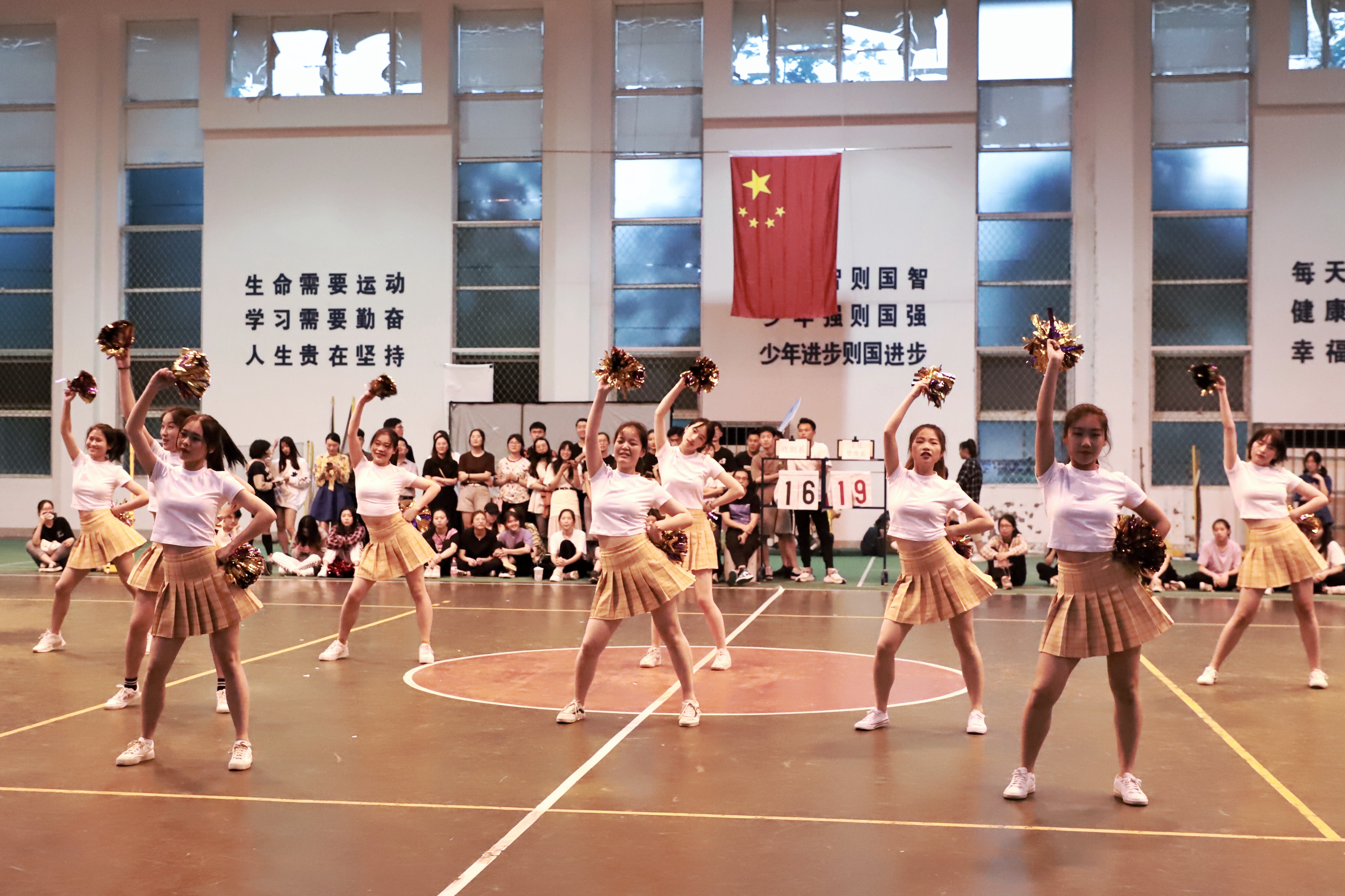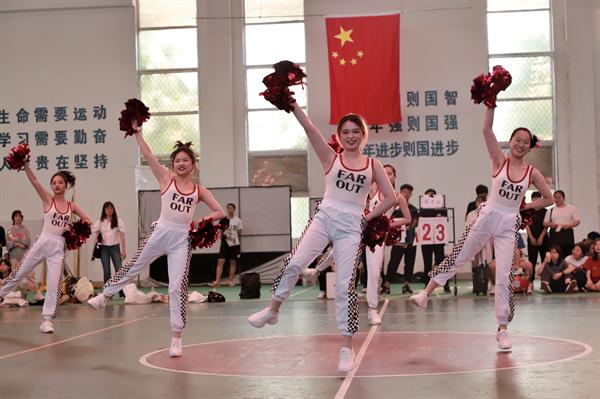 答:这个曲目是我们舞蹈老师选的,因为考虑到要调动现场气氛,我们就挑选了节奏比较明快的,比较嗨的曲目进行搭配啦啦操。(比赛分规定套路和自选套路,规定套路音乐由组委会提供,自选套路由各系自行决定)