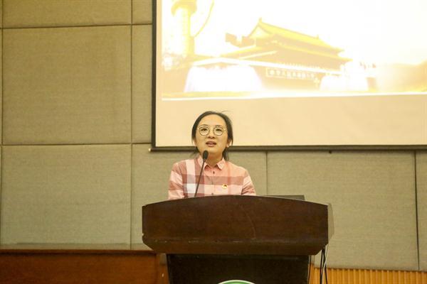 在2019年学校红色经典诵读比赛中取得优异成绩的团员代表楼烽、傅笑针用朗诵作品《祖国啊,我亲爱的祖国》抒发对祖国的无比热爱、无限期盼,表达对中华崛起、民族复兴的振奋,朗诵情真意切、真情流露,赢得了现场一片掌声。