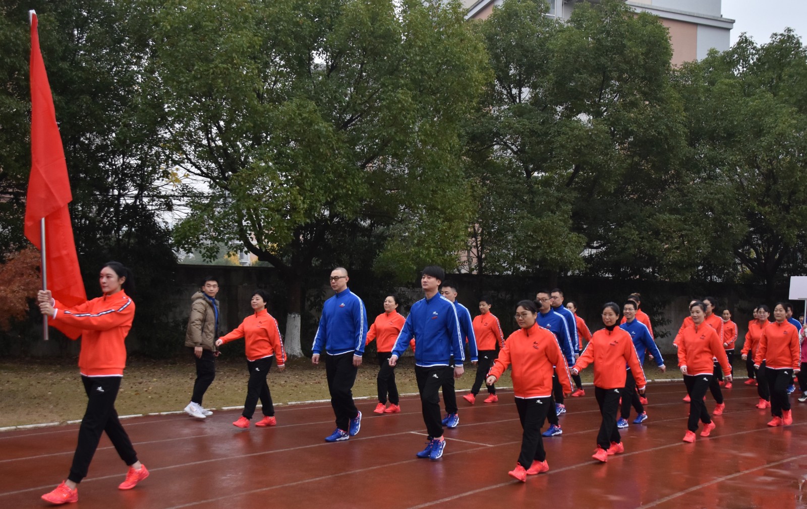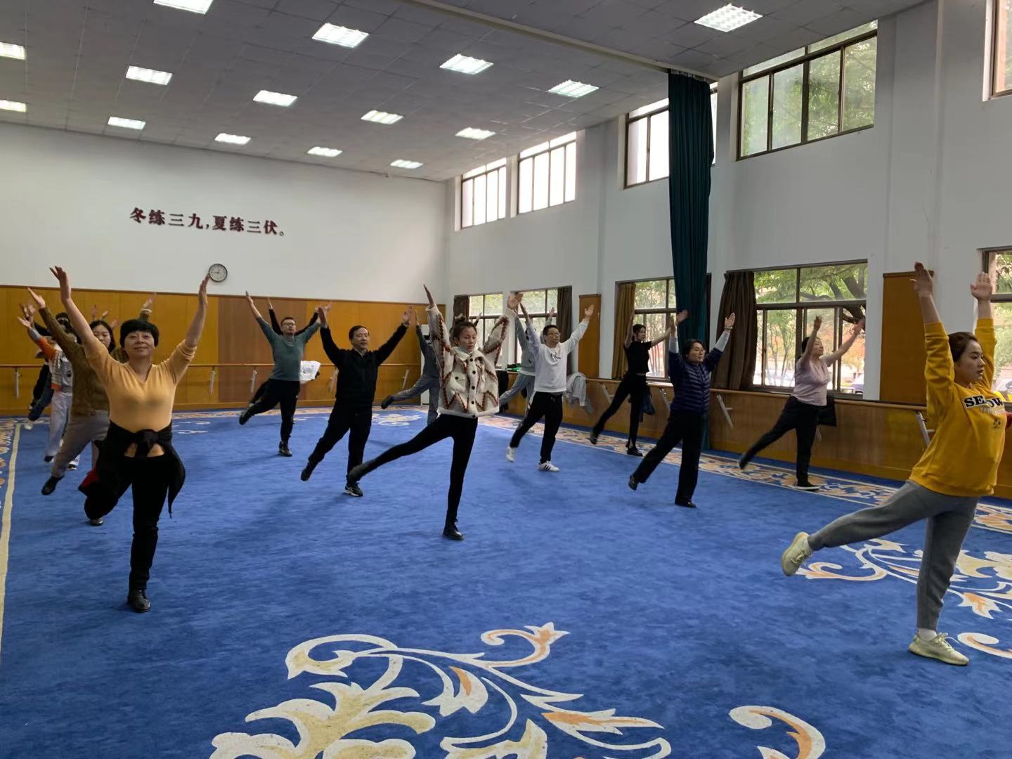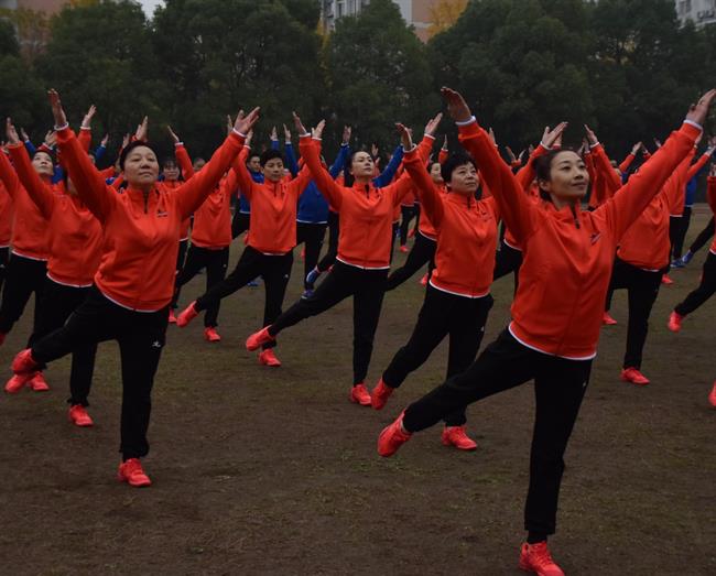 瑟瑟寒风挡不住老师们的激情。戏剧系全体教职工身着统一服装,踏着整齐的步伐,齐喊“凝心聚力,双高建设;奋力打造,重要窗口”走向主席台。做操时,老师们动作娴熟到位,每一次摆头都干净利落,每一次伸展都张弛有度,每一次踢腿都刚劲有力,彰显了戏剧系教职工意气风发、团结共进的精神风貌。