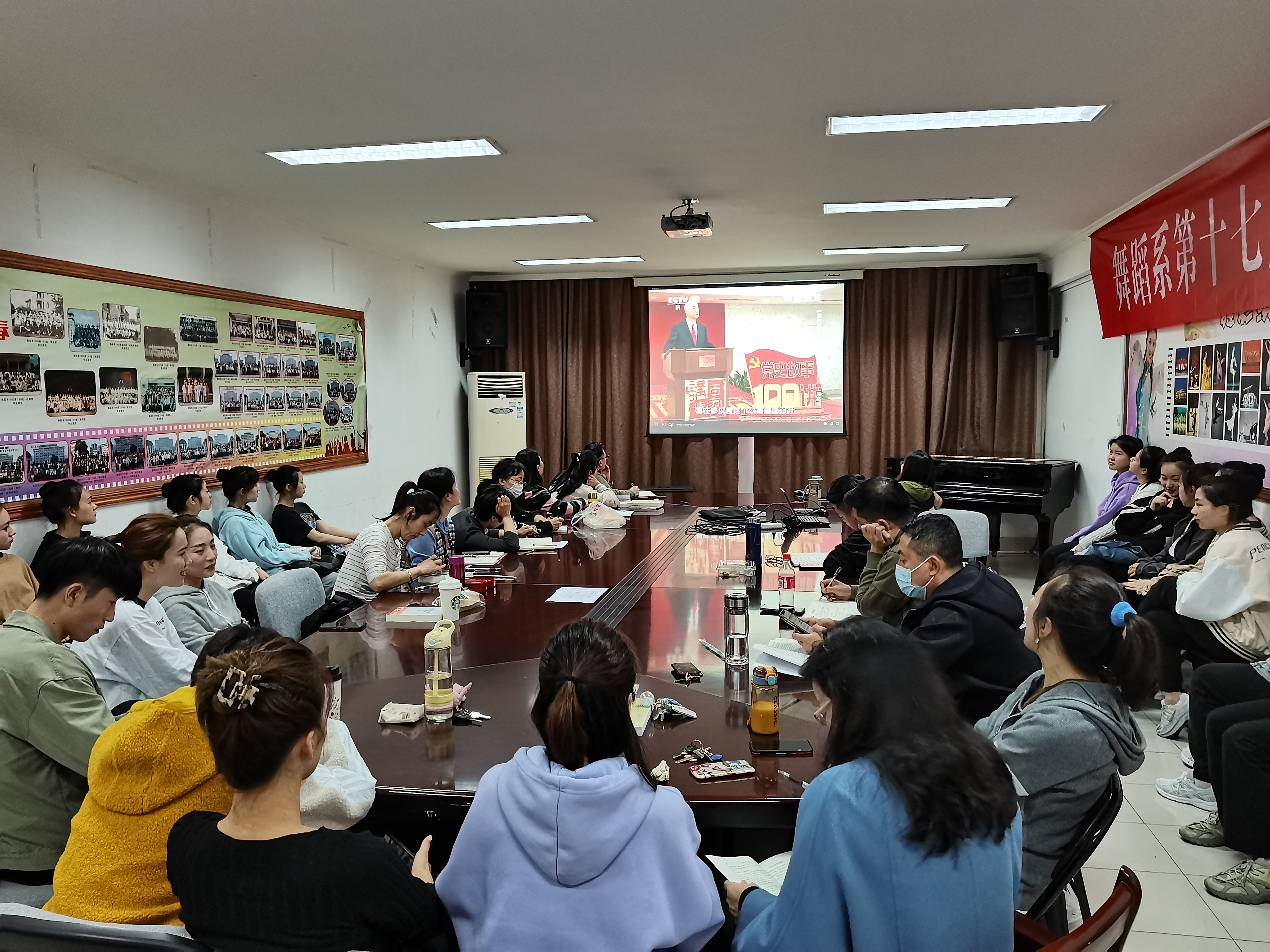 4月16日,舞蹈系举行了第三次集中学习党史活动,浙艺舞蹈系领导班子、教师党员、教研室主任、专业带头人、师生入党积极分子共同收看由中共中央组织部党员教育中心、中央党史研究室宣传教育局、中央电视台科教频道联合制作的特别节目《党史故事100讲》第4、5讲——《一大首聚 开天辟地》《反帝反封 工运高潮》。
