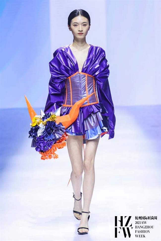 灵感来源中国非物质文化遗产——舞龙和舞狮。在款式设计上,把中国传统文化与荷叶边相结合,以层层叠叠的荷叶边作为细节加强服装的立体效果。在色彩上,以蓝色系和紫色系为整个系列的基调色,佐以橙色点缀,凸显褶裥的各种变化。在头饰设计上加入了舞狮的灵感,传承了中国文化的精髓。