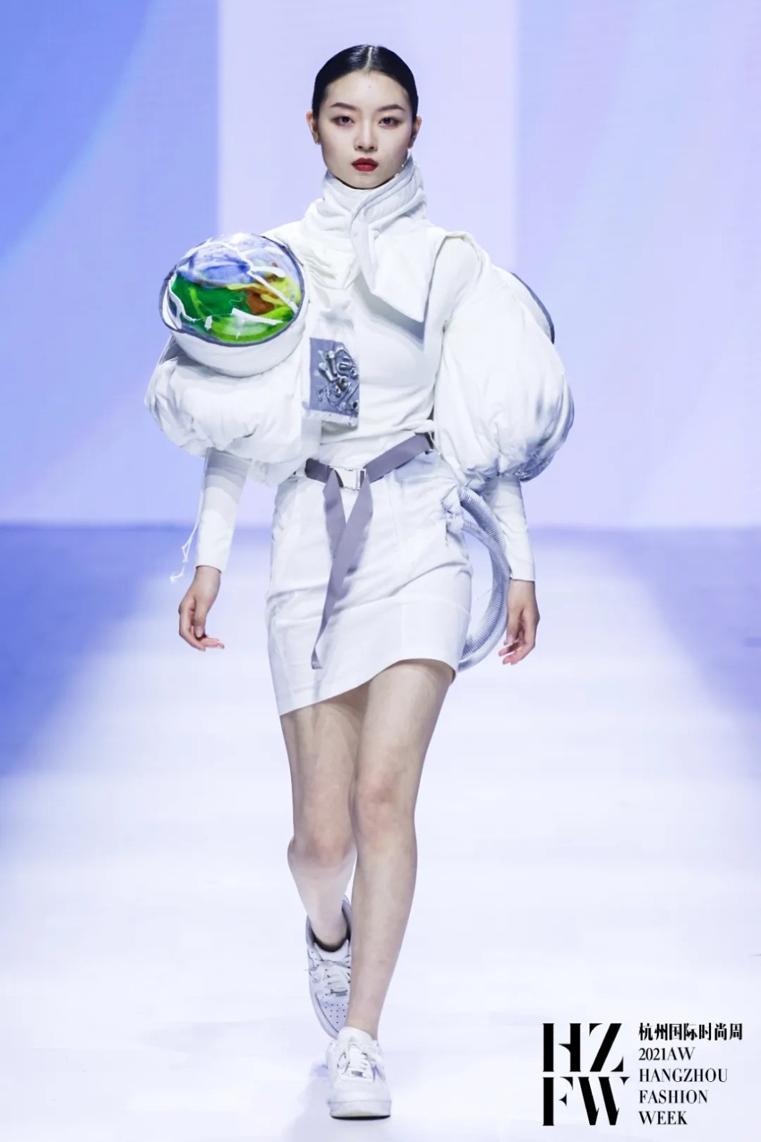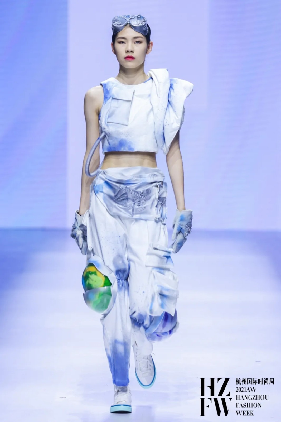作品以简洁干净的白色为主,就如同原本没有被污染过的地球。用喷漆的方法来表现“废气废水”,建筑型轮廓和管子的结合使服装变得更工业风,因为运用了不同颜色的喷漆,又让服装整体看起来不再那么冰冷。其中的一套在服装表面附上了一点地球色系的毛毡和破碎的透明亚克力,结合两边不对称的设计,在冷峻之中调和了一丝趣味。