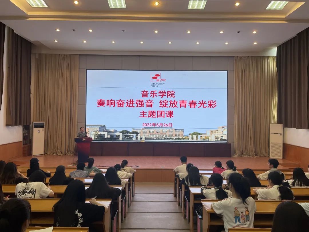 5月26日,音乐学院团总支在图信报告厅开展“奏响奋进强音 绽放青春光彩”主题团课。党委学工部副部长、校团委书记郑吟受邀主讲,音乐学院学生会全体成员2022年新发展的71名团员青年参加。音乐学院团总支书记陈宏主持。