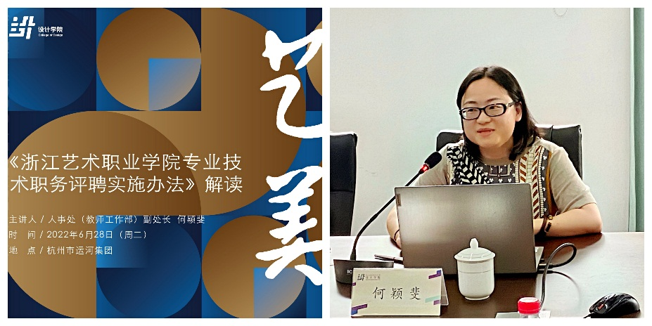 校人事处(教师工作部)副处长何颖斐作《浙江艺术职业学院专业技术职务评聘实施办法》专题讲座。她介绍了近年来我校专业技术职务评聘政策的总体情况,围绕指导思想、晋升通道、晋升程序、注意事项、申报流程等方面的内容进行了详细地说明。二级教学单位在专业技术职务评聘过程中应充分发挥单位的指导和把关作用,教师们在申报过程中要注意凝练研究方向,提炼代表性成果。