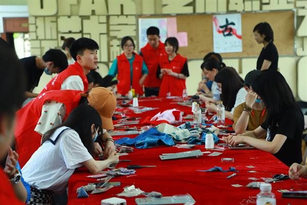 活动体验的师生们首先挑选自己钟爱的布料,将他们裁成12.5x6.5cm的规格,一针一线、细针轻舞、巧手穿梭,将布料缝成一个小布袋。