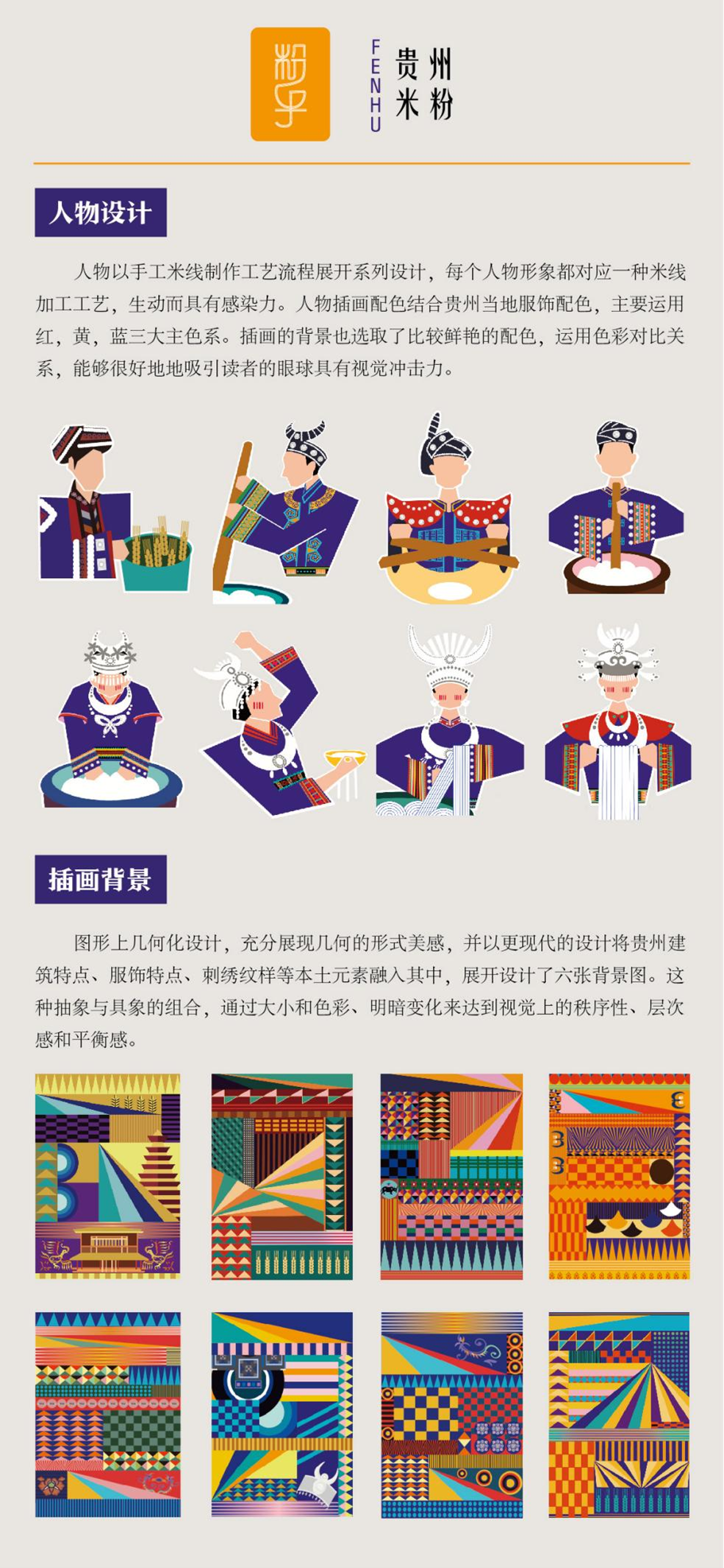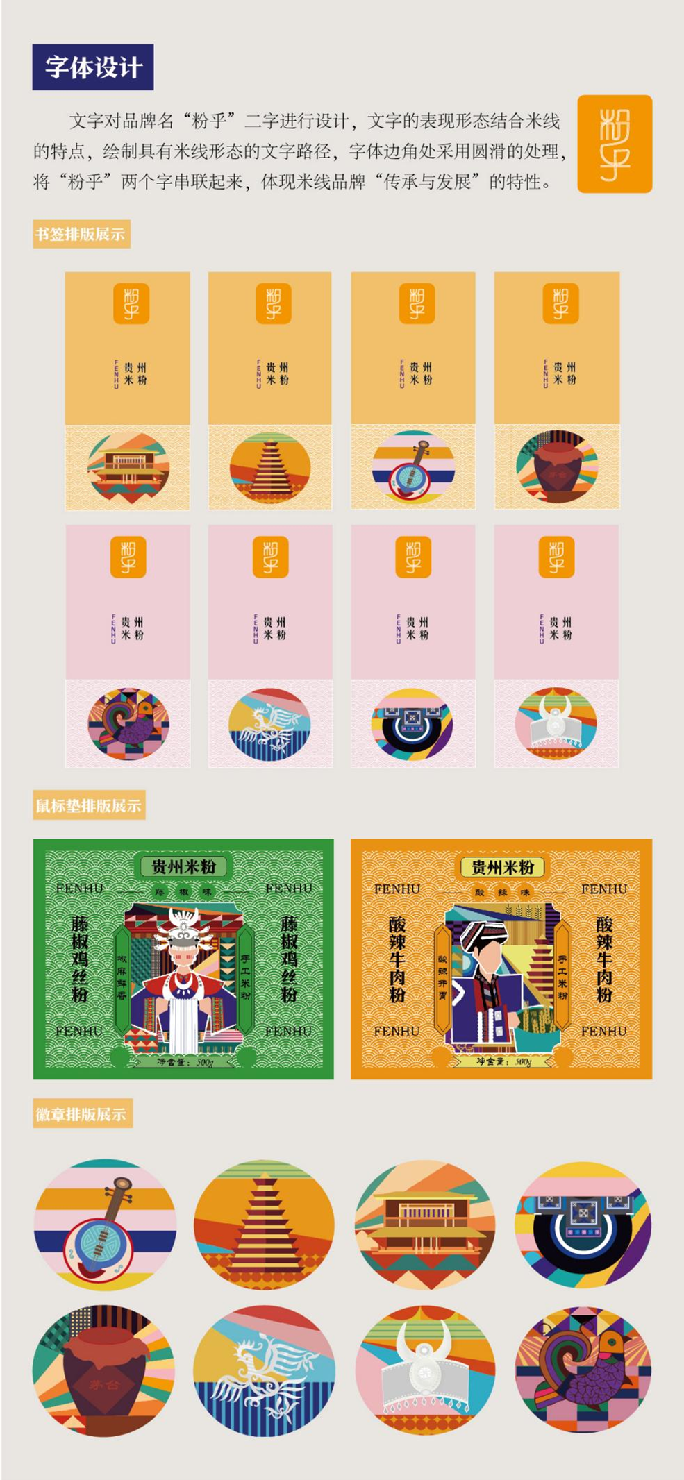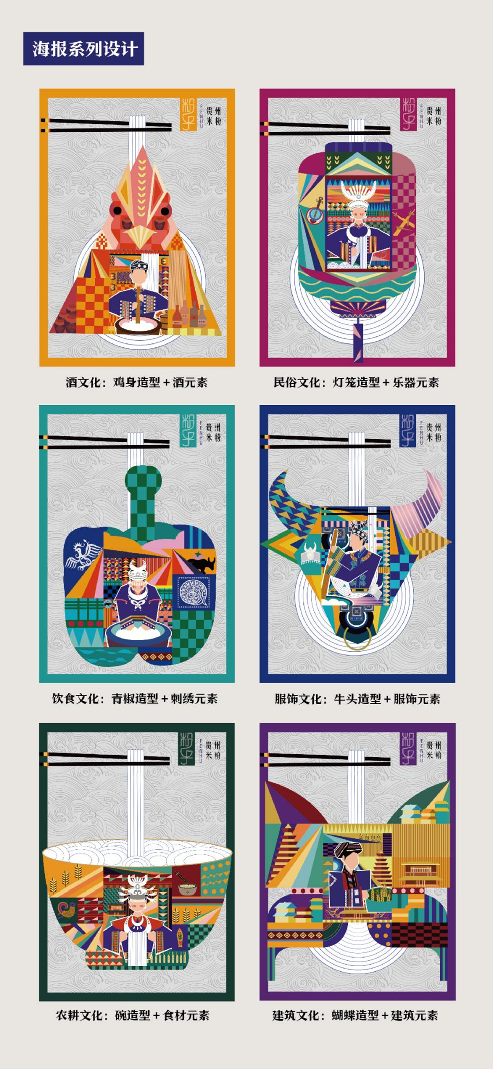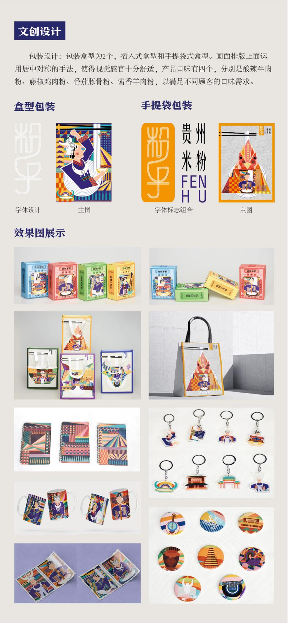 设计说明:课题对贵州当地特色米线--“粉乎”米线品牌进行整体形象系列打造和文创应用,以非遗文化传承与弘扬为主线,将贵州特色手工米粉浸渍、蒸煮、压榨等制作流程和工艺为主要元素,并结合当地建筑景点、服饰纹样、民俗文化、传统工艺等多方面背景,呈现多元性与多样性的贵州文化特征。通过抽象的现代几何风格,不同文化元素组合再造,协助贵州米线“粉乎”品牌,并进行一系列文创产品的开发与应用,助力贵州特色米线产品的市场拓展发展。