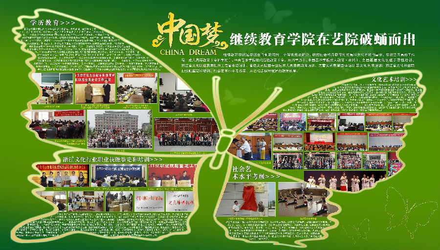 为深入学习贯彻党的十八大精神,引导全院广大学生为实现国家富强、民族复兴、人民幸福的伟大“中国梦”而勤奋学习、立志成才、积极进取,根据浙江艺术职业学院《关于深入开展“我的中国梦”主题教育活动的通知》精神,组织全院各教学单位开展“中国梦”主题教育宣传栏比赛。经过一个月的精心策划、制作,各教学系部策划制作出各具特色的“中国梦”主题宣传栏,有的反映各系教学风采和学风精神,有的反映师生对于“中国梦”的向往,有的对“中国梦”进行溯源,等等,参评作品有着较高的质量,令人耳目一新。