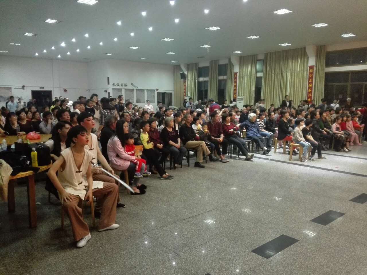 16日晚18:30,“剿灭劣V类水”专题文艺巡演在翁方村文化礼堂准时开始,一支华丽的踢踏舞“格里的旋转”拉开了本场文艺巡演的序幕,接着戏曲、声乐、舞蹈、小品等节目陆续上场,精彩的表演引来村民阵阵掌声,大家乐开了花。歌曲《鹿港小镇》唤起人们对原生态居住环境的回忆,“听说他们挖走了家乡的红砖砌上了水泥墙,家乡的人们得到他们想要的却又失去他们拥有的……”;歌曲《多情的土地》吟唱着美丽的山水,勾起游子对家乡的挚爱,“我轻轻地走过这山路小溪,这山路小溪,捧起黝黑的家乡泥土,仿佛捧起理想和希冀……”。在演出间隙,演员和主持人通过与台下观众互动,进行剿灭劣V类水动员和宣传,起到了良好的效果。期间,在村领导的带领下,演出队伍还参观了翁方村家园馆,了解了河姆渡文化和村史,给浙艺的学生们上了一堂极有意义的历史课。